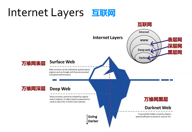 我们还是用上面海洋类比来解释互联网(见上图),今天我们大家熟知的互联网,至少有三个层面,第一层是表面层,也就是露在海平面上的内容,这是大部分用户经常活动区域,第二层是海平面下面的深海层,这是专业人士经常活动的地方,需要特殊工具和身份证才进入的地方,