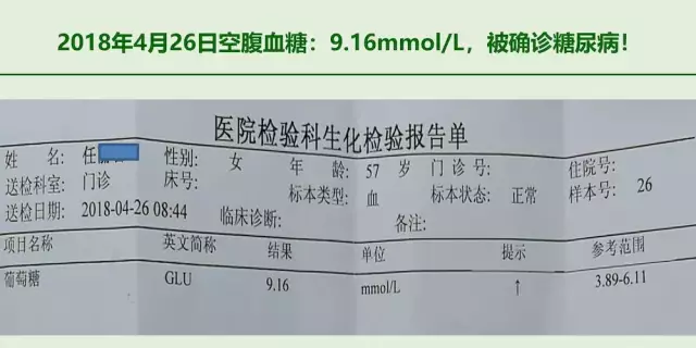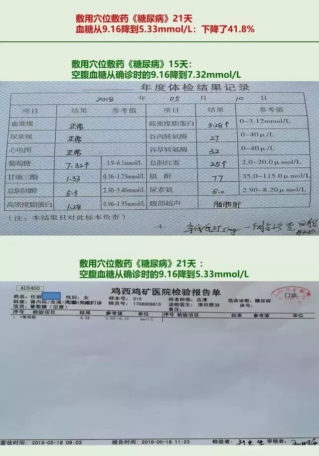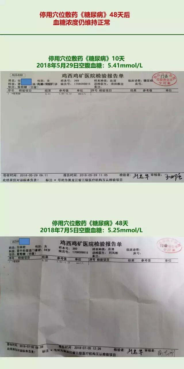 假如你被确诊为糖尿病,你选择何种疗法? 是与中国1.3亿的糖尿病患者一样,终身使用降糖药或胰岛素, 还是另辟蹊径? 糖尿病的真正病因是什么? 本文作者在反复阅读中医经典悟出:血糖高是由于肺脏感寒,身体为驱寒而产热过度,就像感冒后人体发热一样,而过多的热量传到脾胃,使脾胃功能亢进,效率增强,必然导致消化过快,产生的过多血糖,超出体内胰岛素调节能力,血糖在体内蓄积,诱发各种并发症。 如果病因肺寒持续存在,身体便持续产热对抗,久而久之,即成消渴,出现典型的糖尿病证状:身体怕热,多吃,口渴,多尿,而且消瘦。而这些证状,明确地告诉我们:病机在肺焦,肾胱和脾胃。 治病求本,确定了病因和病机,我们就可气味处方,有的放矢地消除病因,转病机为生机,快捷安全地治愈糖尿病。釜底抽薪,远胜于扬水止沸。 但是,这个推测靠谱吗? 临床疗效是金标准 从2018年4月28日到5月18日的21天内,任某某只敷用穴位敷药《糖尿病》,未用任何降糖药或胰岛素,她的空腹血糖从9.16下降到5.33毫摩尔/升, 血糖水平下降41%,糖尿病症状; 下体瘙痒,皮肤病变,口渴,频繁饥饿等症状均逐渐缓解并消失。血糖下降到正常后,她又继续使用穴位敷药,第二天便感觉有点头晕,遂完全停止使用。
