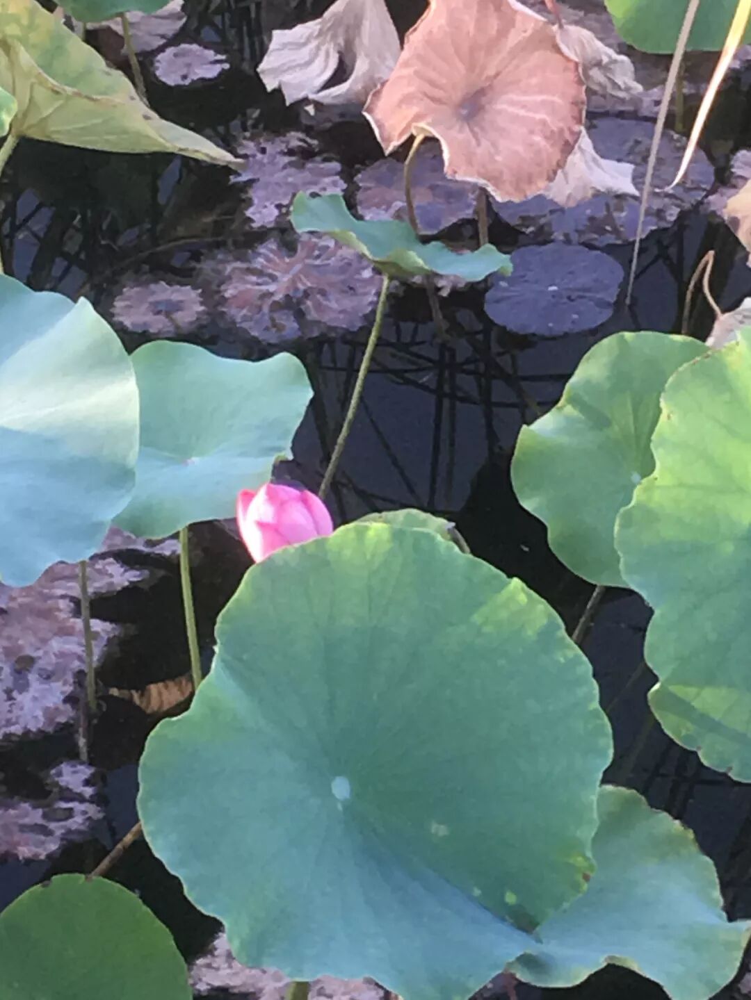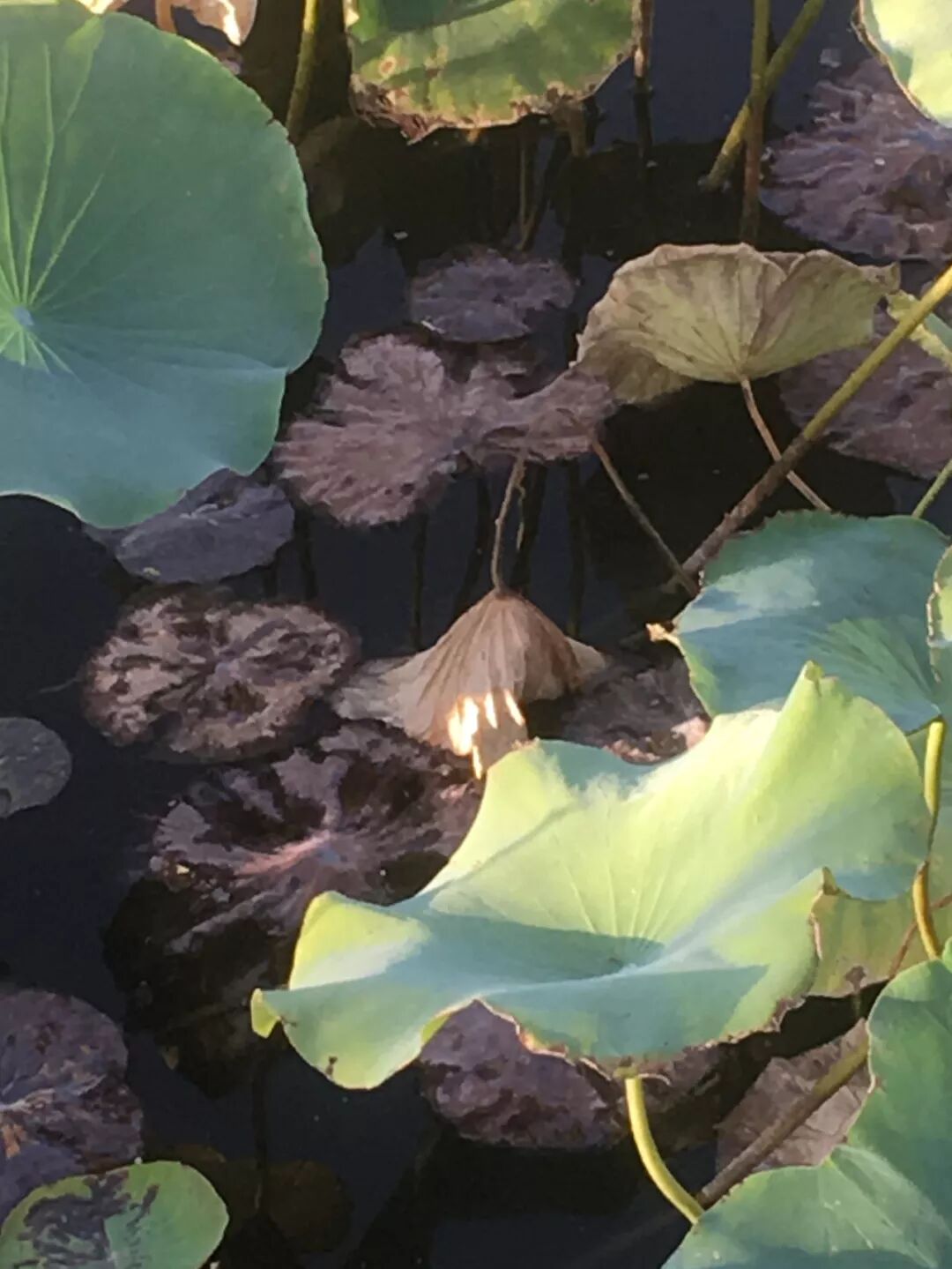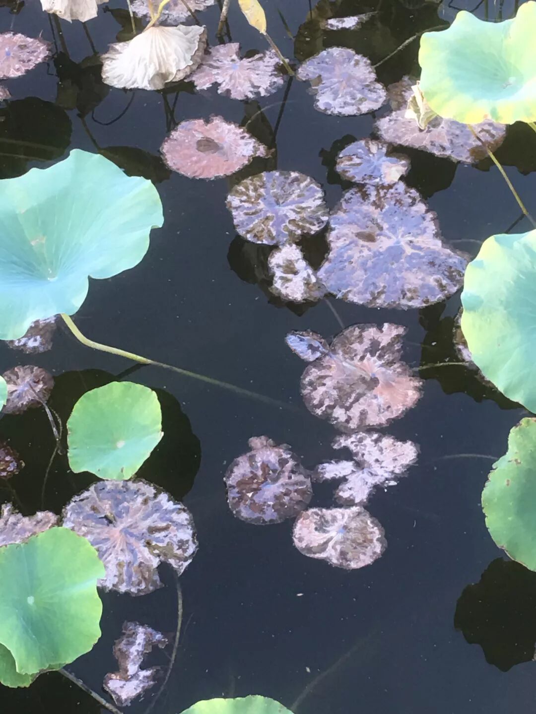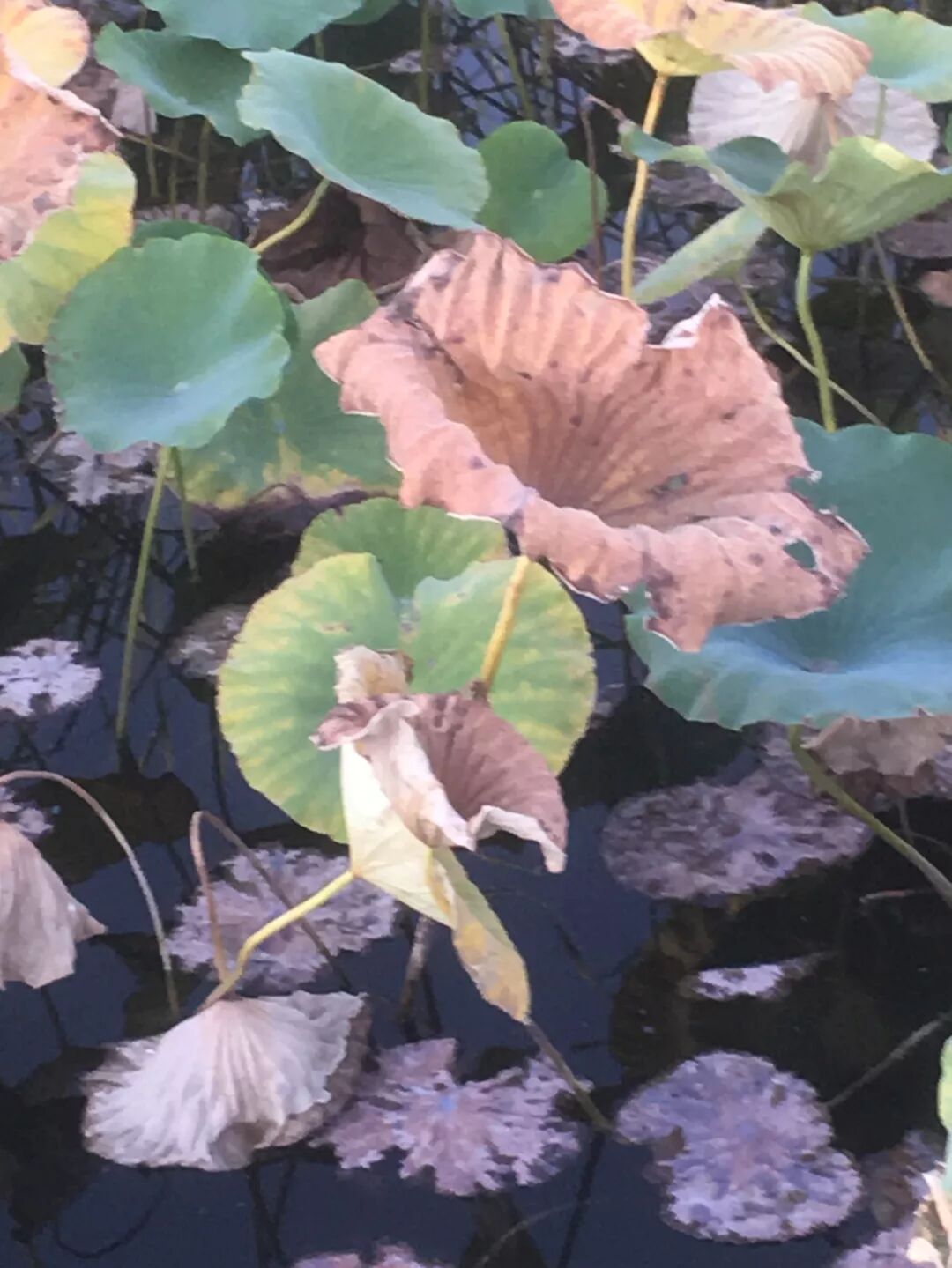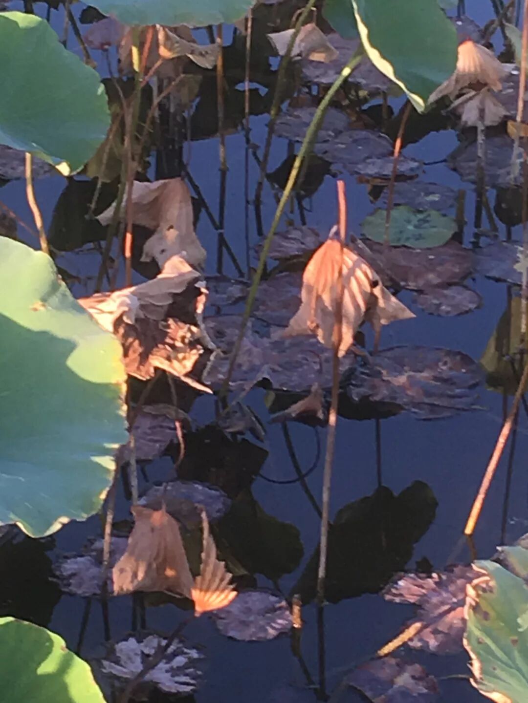 荷花大都谢了,叶子正在变老,残荷片片,硕大的荷叶,这儿失去了一角,那儿捅出了个窟窿。有的,最外边一圈的绿叶全被抽去了,只剩下短短的一根根丝。残叶弯了,残叶昂首,残叶卷成筒。也有的残叶落在水中,那一片脆生生的黄褐色,硬是被水浸得发软,被泡成微微的细末浮在水表面,让残叶模糊了。 是时候了,荷花的死期到了,那就死吧。不过,像荷叶这样的死是美丽的,即使留下最后的残荷,也听风声、雨声、游客的叹息声。