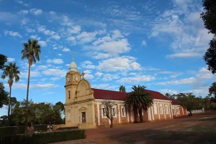(尖峰石阵),而这,正是我想看的奇景。到了景区,一下子就想起了中国的一句老话,沧海变桑田。眼底,变成的不是桑田,而是在一片片金沙上,金沙上矗立着一个个金色的,灰色的和粉色的石柱,千姿百态。走在金沙上,抚摸着一根根石柱,怎么也无法想象,这就是昔日的海底,而不远处,浩瀚的印度洋,湛蓝色茫茫无际。更没有想到,在我离开珀斯前,徐永祥一家竟成了我在基督内的兄弟姐妹。 在珀斯休息期间,洪鼎发夫妇和他们的大女儿琳惠,开车一个半小时,把我送到了小镇New Norcia (新诺尔察),一天后,陈利龙、王蔚夫妇又把我接回去,并且一起漫步在印度洋海滩,看到了印度洋最壮观的日落。新诺尔察是一个小镇,整个小镇就是一个修道院,并且是澳洲唯一的修道院小镇。这里,方圆几十里没有人烟,夜半我仰望星空,天宇广阔、幽暗、神秘,我又一次体会到了帕斯卡尔名言的深邃含义,这永恒沉寂的星空令我的心灵颤栗。但这颤栗之中,渐渐涌上一股暖流,就是在小礼拜堂中僧侣一再吟诵的诗篇,最后,他们吟唱:“哈利路亚”