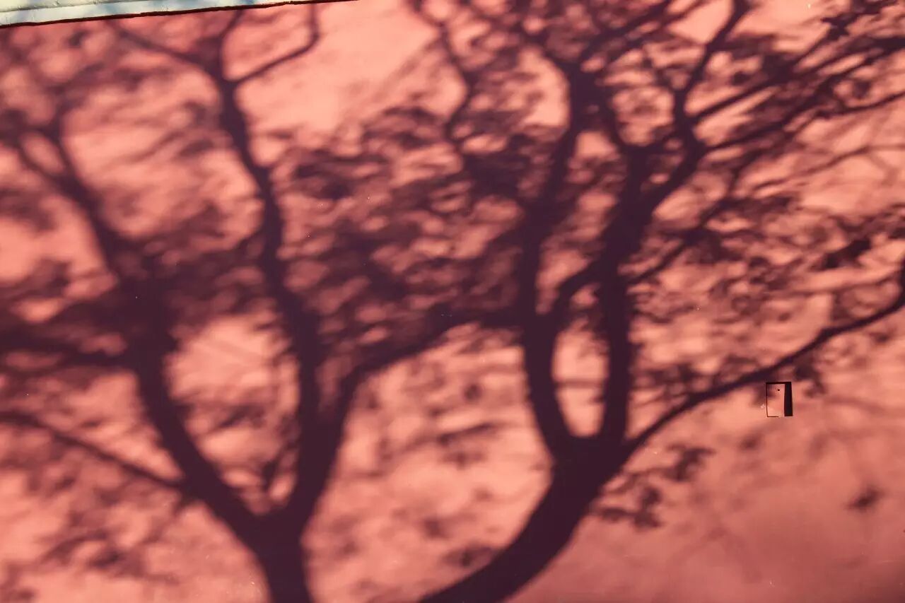 为了离开车道远点,我走到了大墙根前,一抬头,吓了一跳,这映在了红墙上的树影真美,树形有些虚幻,而影子的暗红色与浅红色辉映,美极了。我看了这棵树的影子,又看那棵,然后往远处看,看暗红色的大树干,竟然产生了一种人性的感觉,带着温暖的力量。哦,原来红色并不意味着血腥。