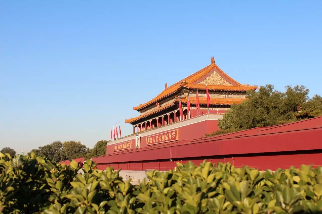 我走到了天安门城楼的侧面。绿色的植物,红色的城楼,湛蓝的天,很帅气。