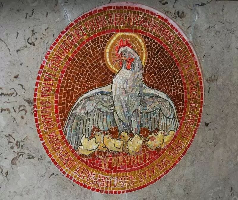这个图案是一个金色的马赛克拼图,它保存在耶路撒冷的“主哭堂”内,就在圣坛的正面,图案的主体是一只老母鸡张开了翅膀,它要把小鸡雏都笼到翅膀底下。老母鸡的头有一道光环,象征着耶稣基督,而小鸡雏正好七只。