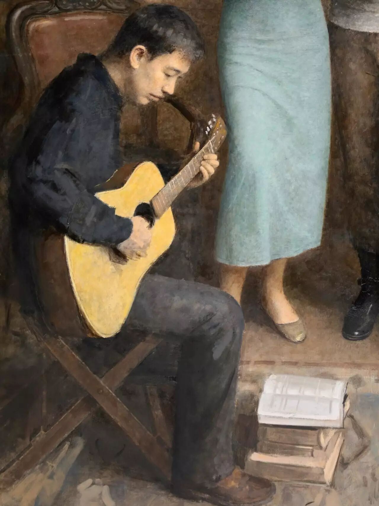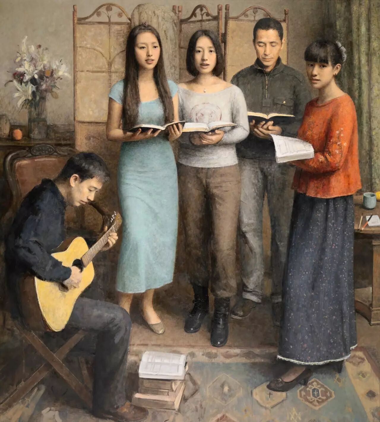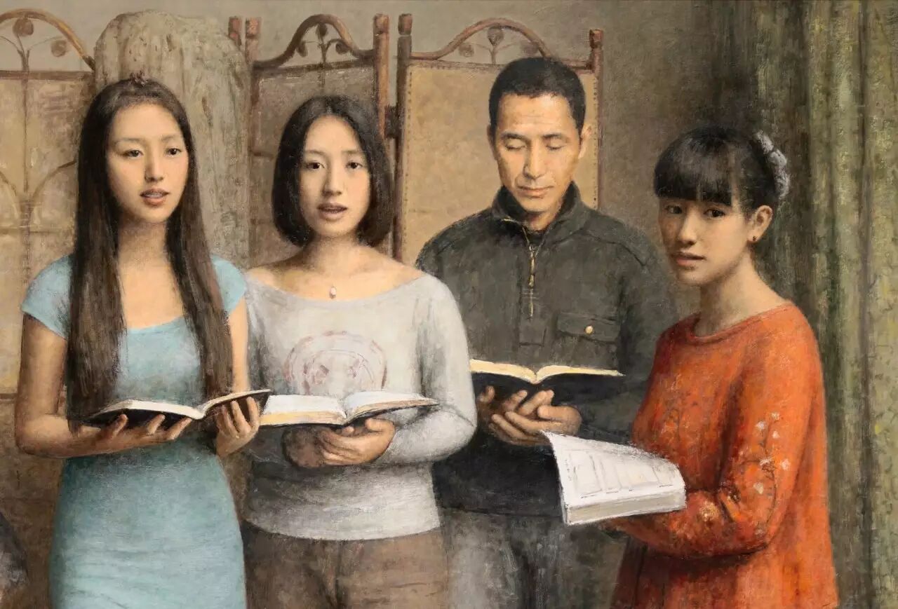 2014年第12届“全国美术作品展览”,有600件油画作品入选,其中90件进北京展出,这里面有朱春林的《诗歌》。其实它的名字应该叫做《诗班》。教会的思维兄弟姐妹正在练习。