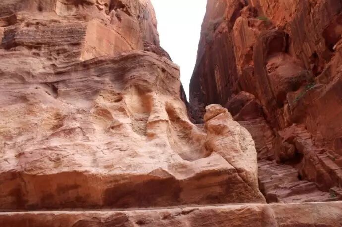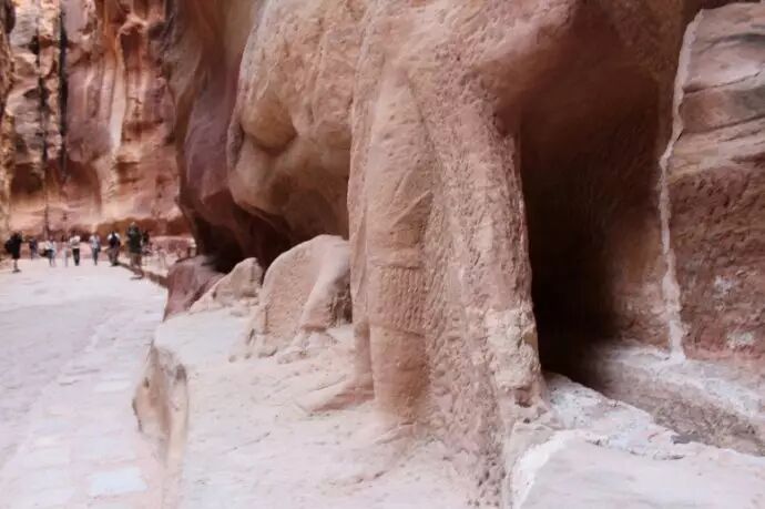 如今,水已干枯,只剩下这半尺宽的水道随着蛇道弯弯曲曲,在有些石壁上,水道已经断裂,有些地方,暗红色的沙子堆满了水槽。蛇道也是如此,当年铺就的一块块大石板,如今,有的也已经残破了。只有马蹄,还荡漾着千古依旧的回声。 水槽之上,时而,绝壁上凹进一个神龛,昔日,这里供奉着纳巴特人信奉的神明:Al-Uzza(马兹神)和Dushara(朵莎拉神),朵莎拉神像只雕刻出了眼睛和鼻子,没有嘴,据说,它代表着神明什么也不说,只是用眼睛注视着世人。到如今,神龛大都空了,剩下的神明也都模糊了,连眼睛也不见了。行路者如我,连细细看一眼它们的兴趣也没有,倒是当地人拦起了几个地方,拍照,交钱。倒是一块像大象的巨石至今吸引着人们,史麟承和林以真夫妇回来时,我还在那里为他们拍照,而拍照mary及柴志达和柴蒋笃平夫妇时,他们正坐在一个长条的石头上,以之为长条椅子。曾为华欣、程亚安和三个当地人一同拍照,刚照完阿拉伯小伙子的满面笑容,就大喊,一美金!我撂下他俩付钱就走人,走累了躺在石板上看一线天,起来,又大步流星地狂奔。