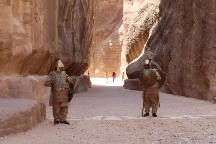 令我震惊的惟有东方大地, 玫瑰红墙见证了整个历史。 (注1) 古老的传说中,这是“摩西之谷”,当年,摩西曾经用手杖敲击峡谷,于是泉水喷涌而出,峡谷一侧的石壁上,齐腰高处,开凿出一条长长的水槽,纳巴特人用来蓄存雨水和从摩西泉眼引来的水,储存在城中心的大池塘中,供人们生活之用。