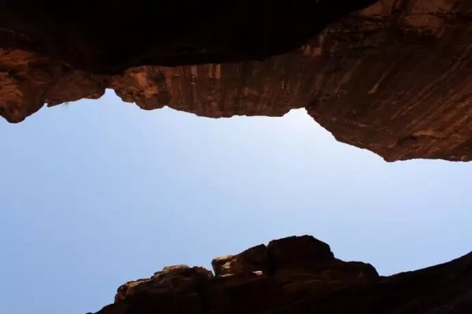 Sig( 译为“蛇道”,或“峡谷分裂出的小道”)入口前收住脚步。耐住心听导游介绍,他话刚结束,我和丹牛立即开拔,疾步如飞,这1200米的谷中通道,要一步步丈量。对面,星星拉拉走过几个游客,步步慢,沉重从头顶压到了脚底。滴滴答答,马蹄声轻快地从山谷中急速传来。 不愧是蛇道,蜿蜒曲折,仿佛一条蟒蛇在山谷里钻来钻去。宽处,不过两三米,窄处只能容一辆马车驶过。上百米高的山石耸立,几乎遮住了长天,昂首,天只剩下了一道蓝线,也像蛇,弯弯曲曲,扭来扭去,时宽时窄。从天而降的巨大山岩,或挺起鼓鼓的肚子,或瘦身如一个苗条的少女,或凹进厚重的身躯。水痕,在褚红色赤褐色的山体上留下长长的波纹,略微发黑,自上而下,一泻千里,直下,直下。耳朵贴到石头上,似乎听到了远古的水声。 偶尔,一棵孤树廋弱地在夹缝中挺出赤裸的身子,小小的野花,则在一片花瓣上染透了淡黄,一弯绿草,青翠欲滴。挺拔的竹子在山洼里长着,多了点,似乎是人栽种的。绝壁最上面,几簇野草,几片青苔,微微发亮。天光要直射下来,却被凸出的山石挡住了,只留下明亮在半空中闪耀,巨大的阴影黑红,在谷中飘来飘去,散发着一丝丝凉意,牵动着微风。 佩特拉的岩石是一座色彩的宝库,褐色、红色、红褐色、淡蓝色、橘红色、暗红色、黄色、紫色、绿色和红黑色,色色俱在。或如飞瀑从天而降,或如楼梯旋转上升,或如波浪层层推进。它们流啊,流啊,在这里凹进去,那里凸出来,翻过山骨,跳上峰顶,正尽情地泼墨,突然,天崩地陷,它们就停在了那里,成了千古绝色。人说到,世上只有两个峡谷拥有这般绝色,就是这里和美国亚利桑那州的羚羊峡谷。就像英国诗人威廉贝根所写的《致佩特拉》那样: