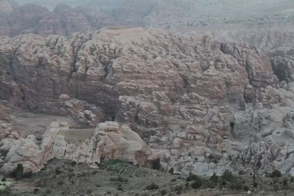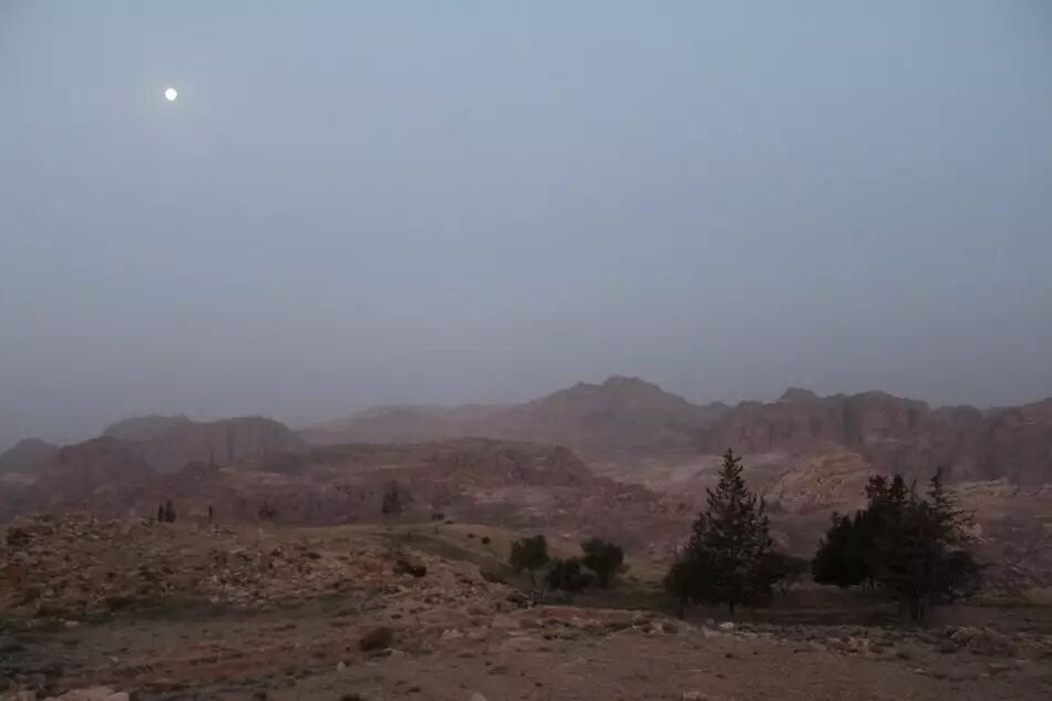 我们走出了旅馆,旅馆在山上的一个高坡,一侧是大山坡,另一侧是大山沟。我们顺着下坡走到了旁边的山沟,这是一片下坡地,正对着佩特拉。一轮小小的圆月还挂在天上,佩特拉山谷笼罩在淡淡的雾蔼之中,黄褐色的山岚起伏、交错、一重、又一重。没有听到鸡鸣,倒是小毛驴,叫了又叫。几户人家,孤零零的,散落在山脚,不见人影,也不见炊烟。