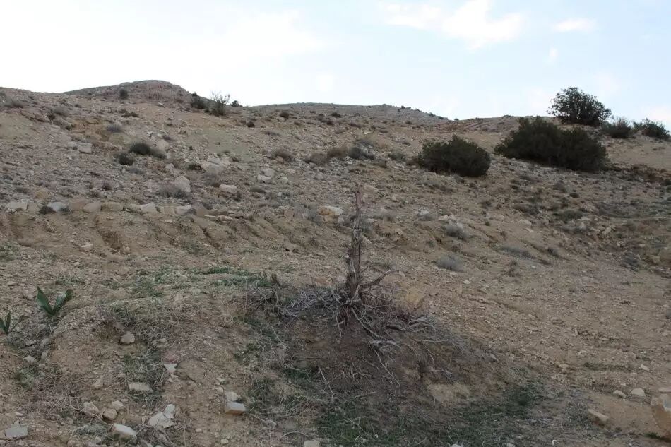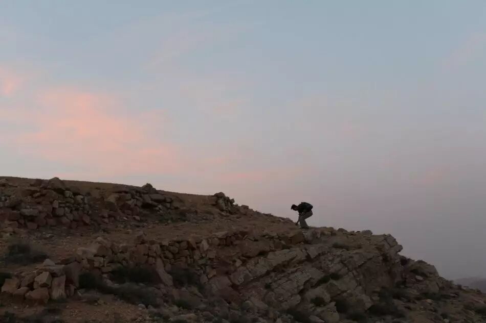就在我们专心捡石头时,高坡上出现了彩霞,哇,赞美主吧,你居然把彩霞也投入到石头上。佩特拉山谷渐渐亮了,黄褐色渐渐多了许多暗红色,而山形的险峻突兀之势也更加清晰了。丹牛发现了一株野花,赶紧蹲下拍照。我看到了一个骷髅,和丹牛猜了一会儿,最后决定,算它是羊的吧。枯树根,这一堆,那一堆,不知道死了多少年。荆棘丛,一米多高了,还没有长出一片绿叶。