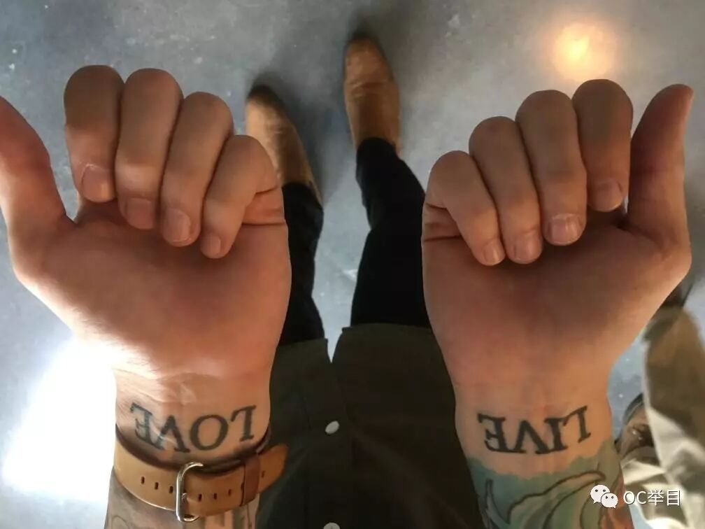 他的手腕上一个刻了一个字:“爱”(love)和“生活”(live )他把两只手并在一起说,说,从那边看都可以。爱是生活。生活就是爱。有趣。后来,他还把他妻子叫来,原来,他妻子胳膊腕上也刻了字。