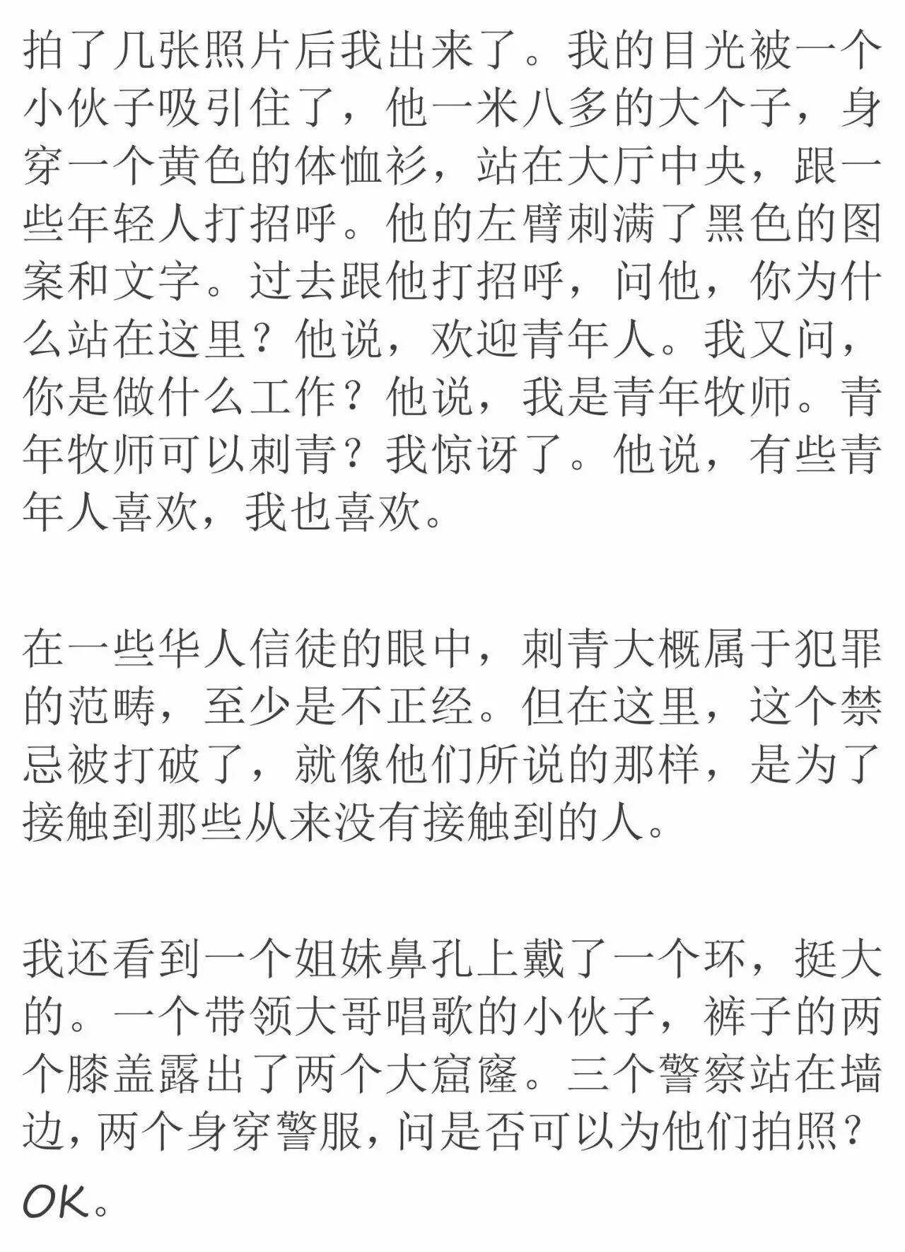 我看到后直接问他,你喜欢刺青?他说,是的,一些人像我一样的年轻人都喜欢。我又问,这些刺青是你信主前刺的,还是信主后?他回答,信主后。为什么呢?我困惑。他回答,为了传扬耶稣啊。