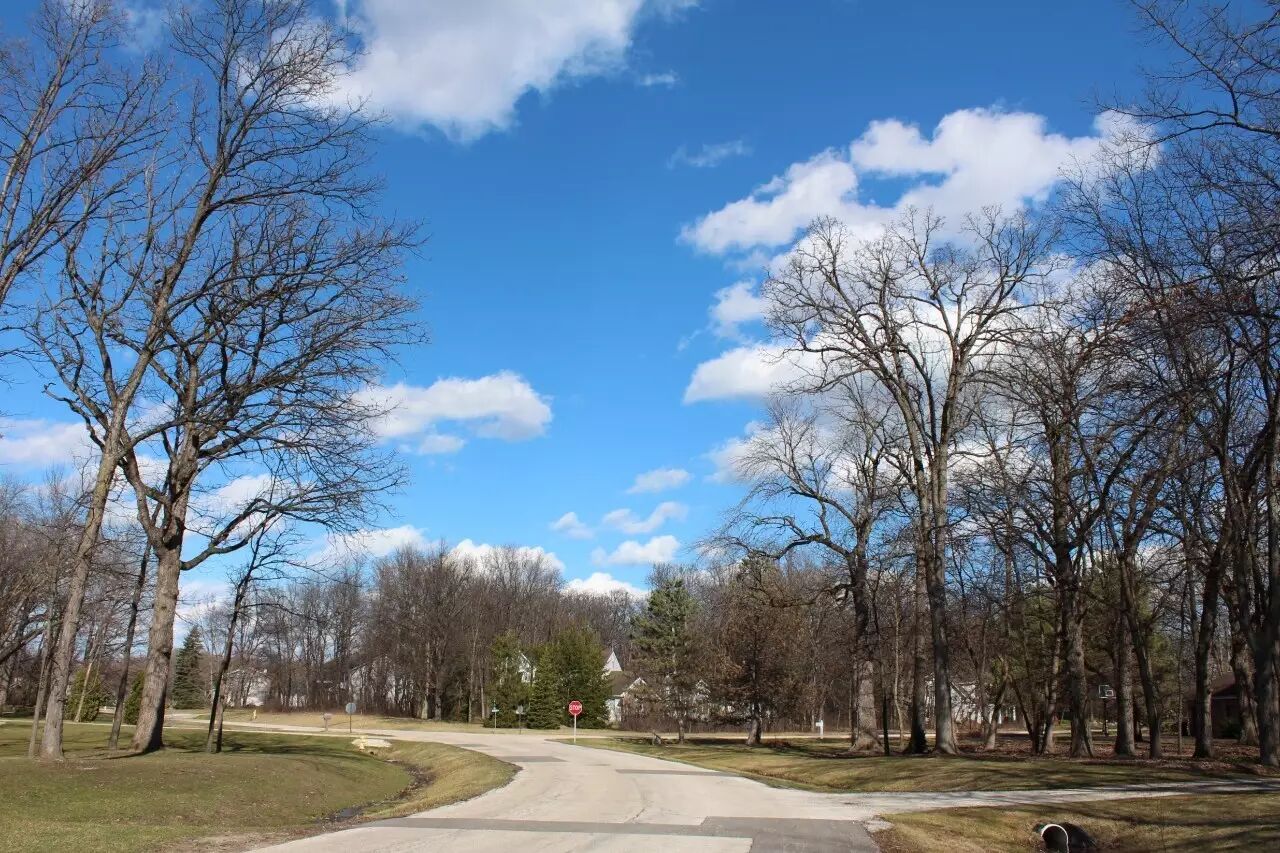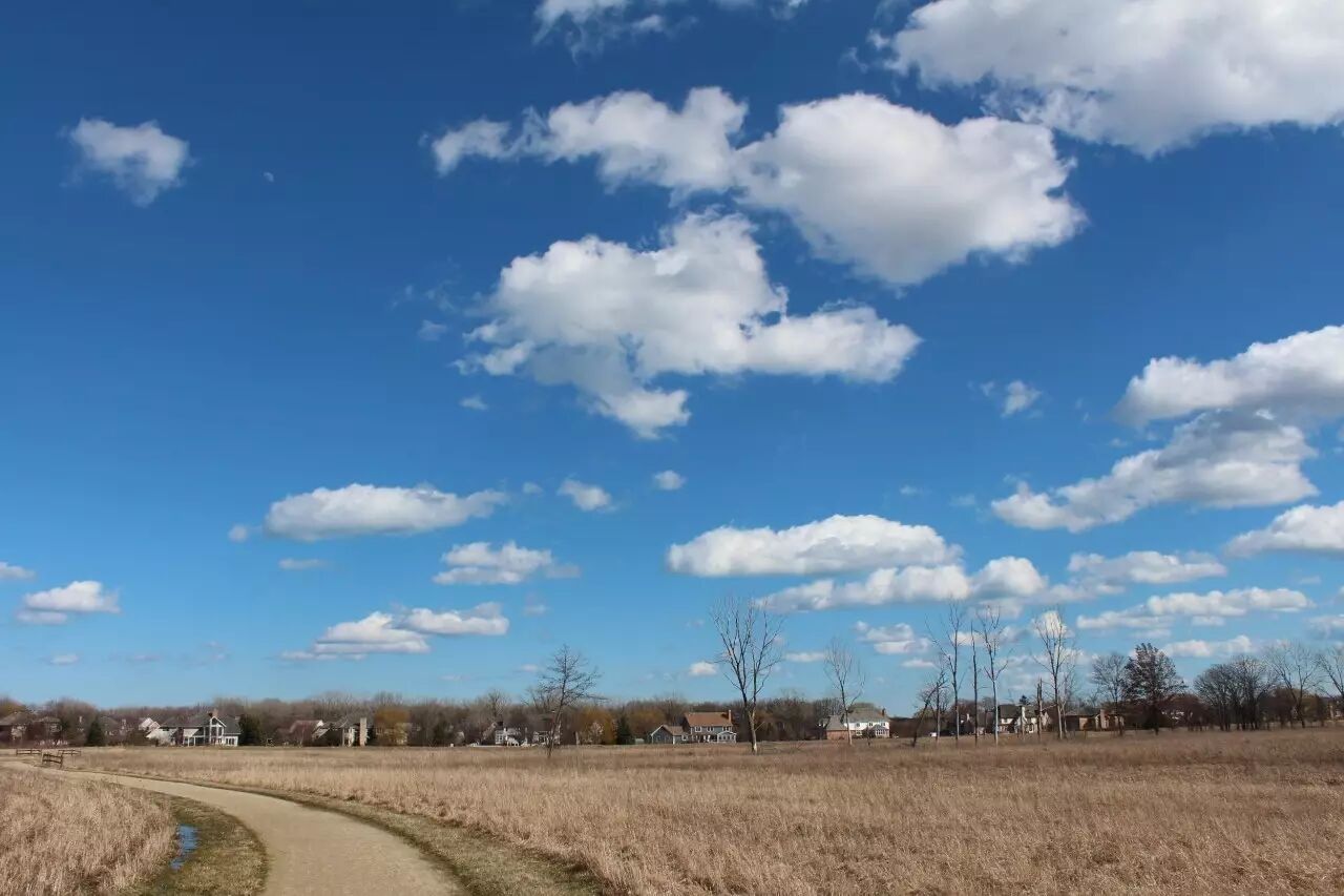 走不过去了,回头走。顺着一条小路,往另一个公园走,这个公园叫独立园林公园 (Independence Grove),特大。与爱德勒公园接在一起。黛斯普蓝河,从两个公园的旁边流过。 黛斯普蓝河涨水了,水面灰乎乎的,几根小木头在漂流。走了几百米,到了公园西侧的外面,一片茂密的小树林,遮住了流在林间的黛斯普蓝河,也遮住了独立园林公园,眼前出现了一大块空旷的荒野,上百亩的坡地上长满了荒草。高处,大树连成了墨绿的一线,低洼处,集满了水,蛙声阵阵,还夹杂着小鸟欢快的叫声。