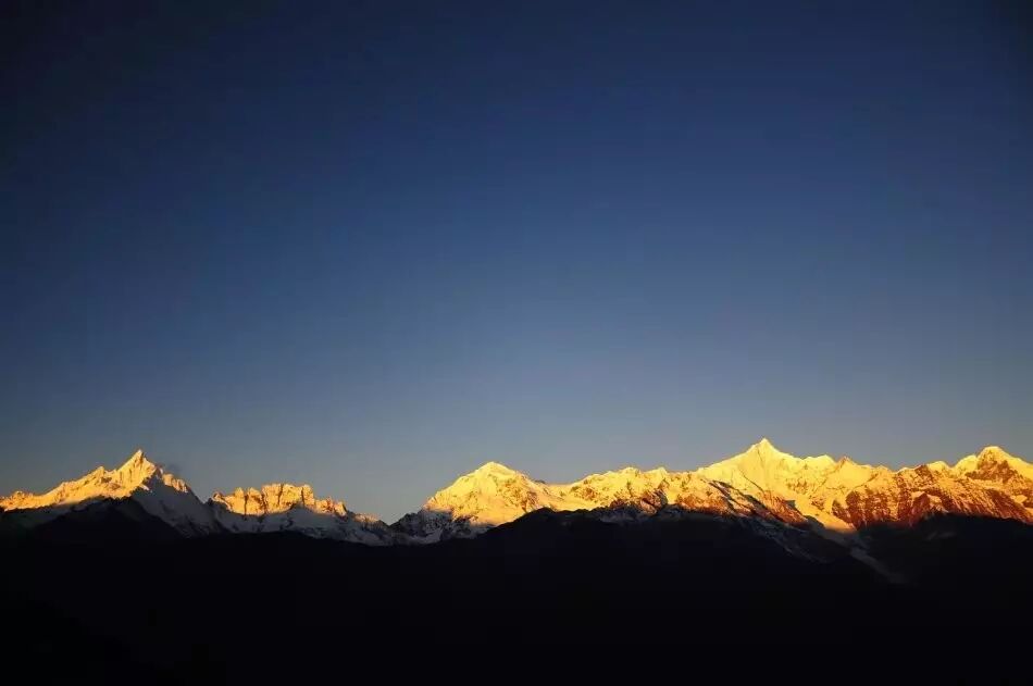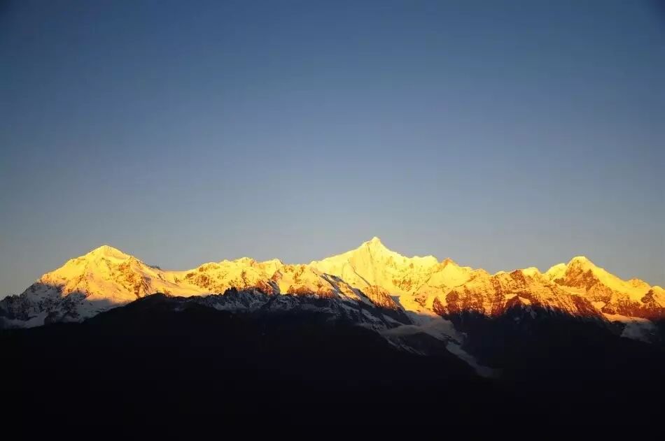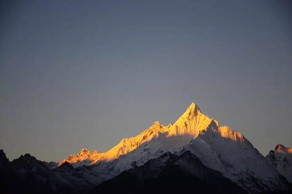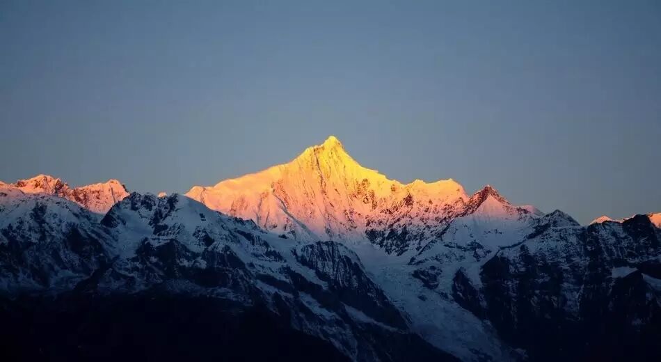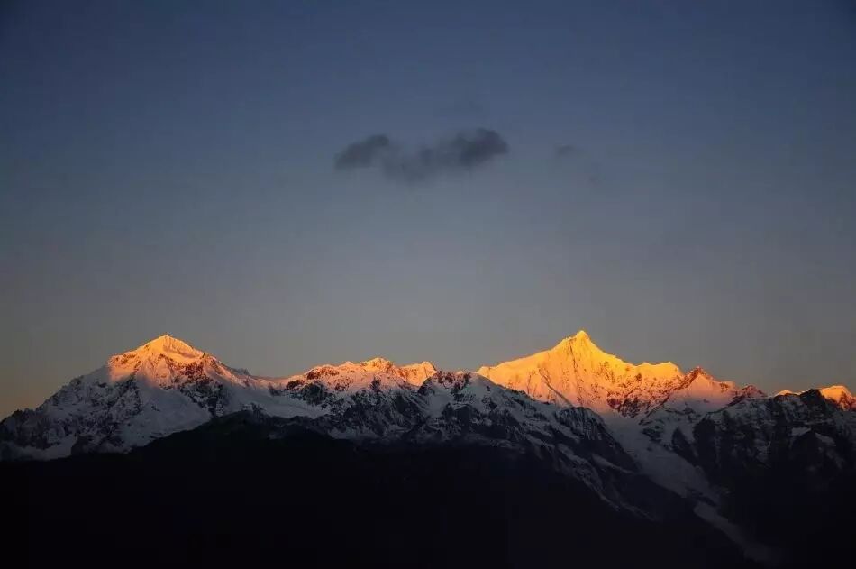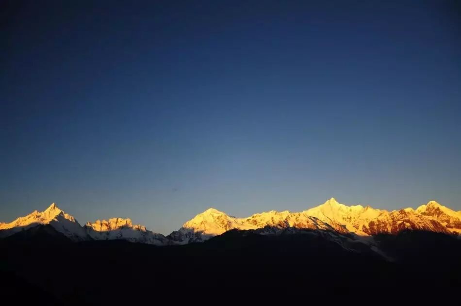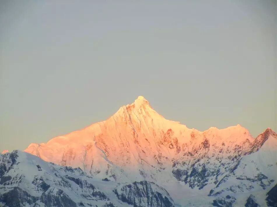 突然,从我们身后的高天上,一束金光打在了对面的太子峰的最尖顶,就是一点,鲜红的一点,刚刚还是雪白的尖顶立即变红了。我赶紧看了一下表,七点三十分。 金光异常明亮,它迅速向下流动,如大江出深谷,一泻千里。不一会儿,红点变成了一条金光,一小块金光,金光一大片,金碧辉煌。整个的太子峰峰顶全红透了,明晃晃,金灿灿,庄严神圣,净化寰宇,正是一顶无比尊贵的皇冠。 这是上帝为这座圣山加冕。我屏住了呼吸,心思被这皇冠完全吸引住了。 从来没有看到这样的日出,伟大,辉煌,纯洁,神圣。 主啊,我的神,你是圣者,惟有你是圣洁的,无比的圣洁,此刻卡瓦格博山巅为此作证。