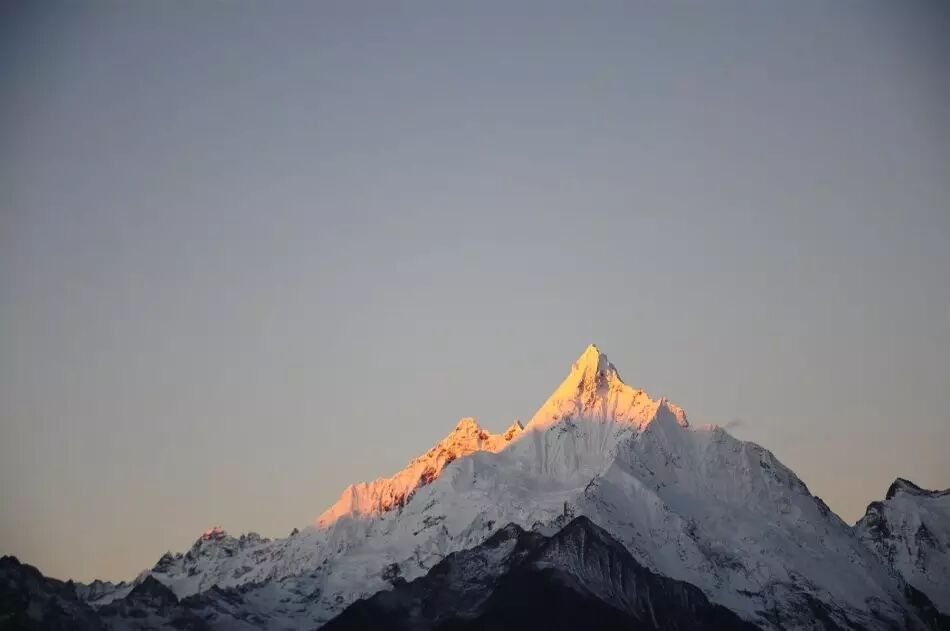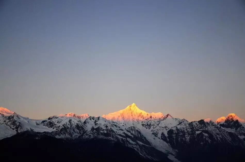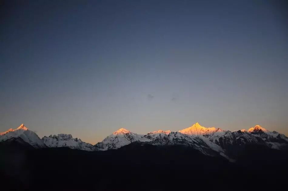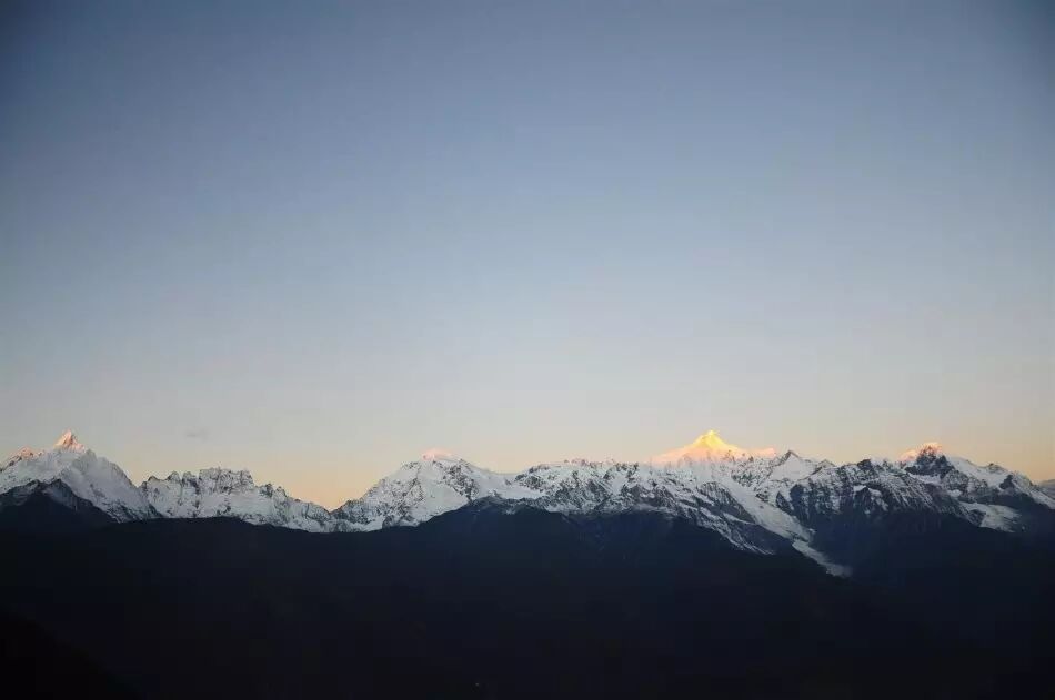 “日照金山” 十月二十七日清晨,这个日子我注定终生难忘,五点多我就醒了,虽然身子有点不舒服,但灵魂却异常敏锐,我和小司布真,韩博一起走到旅馆的阳台上,看对面的梅里雪山,附近的阳台,眼底的飞来寺观景台,许多人站在那里,和我们一起等待那个庄严的时刻:日出。 梅里雪山也在等待,等待着太阳照在他身上,“日照金山”。 天渐渐亮了,梅里雪山的山骨银灰,雪野洁白。最高的太子博峰在晨空中昂首。