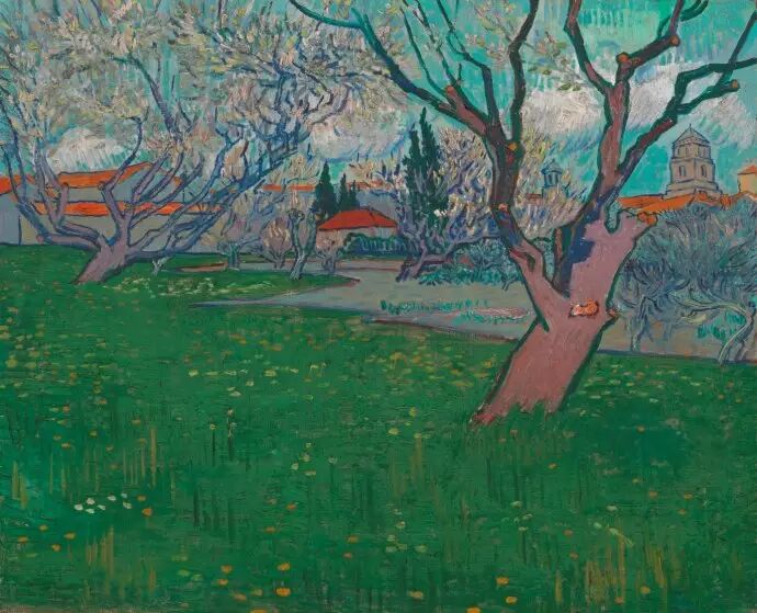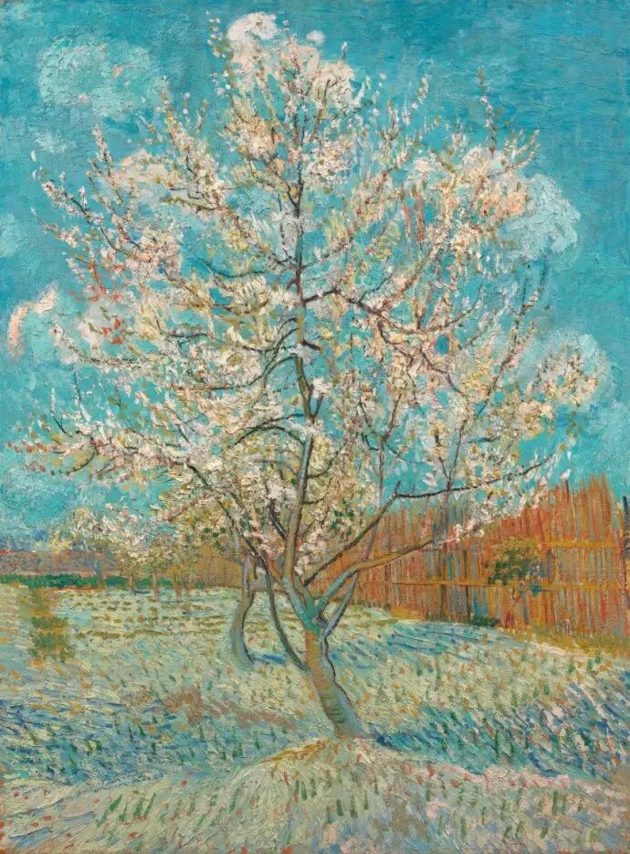但是梵高没有被苦难所征服,反而,他用色彩战胜了苦难,《杏花开了》这一片安宁,将人带入瞬间的永恒,永远对着人的心灵说话。尽管依旧有春寒,但梵高赞叹,“今天是一个真正的春日:嫩绿的麦田,远处是紫色的山丘,如此美丽,杏花已经恣意地开放了。”也就在这一天,他告诉母亲,他在为小侄儿作画:“我已提笔为他们的卧室画一幅画——蓝天下,一大束盛开的白色的杏花。”