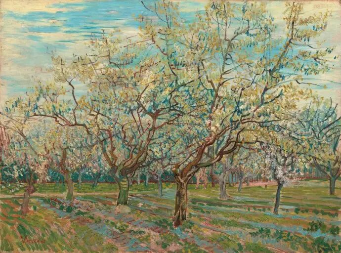 第三次回到《盛开的杏花》前,我退到了两米后凝视着画面,那作为背景的水蓝色的天多么清纯,寥廓。不知道梵高是有意还是无意,他在画面的右下角和左上角,留了大块的空白,没有一物,只有纯净的天蓝,把我的心引向永恒。没有梵高惯用的漩涡,没有山岚起伏的色彩,连浓涂厚抹也舍弃了,只有无边的宁静,带着纯而又纯的天蓝水蓝向四周弥漫。