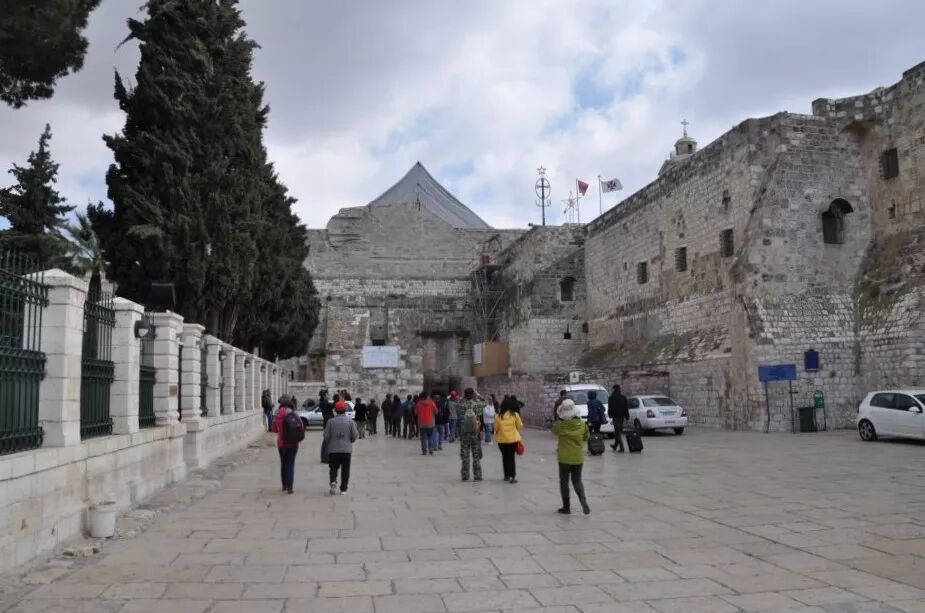 前方就是圣诞教堂,英文是Churchof the Nativity,中文又被翻译为主诞堂,伯利恒主诞堂,耶稣诞生教堂。教堂前面的大广场,则只有一个译名:马槽广场。