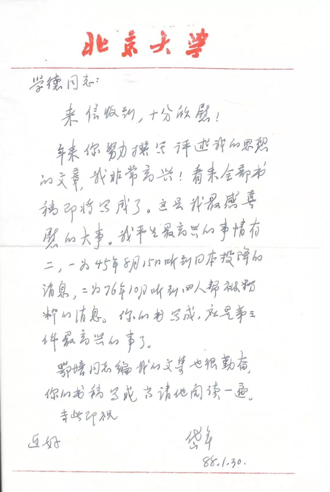 年来你努力撰写评述我的思想的文章,我非常高兴。看来全部书稿即将写成了。这是我最感喜慰的大事。我平生最高兴的事情有二:一为45年8月15日听到日本投降的消息,二为76年10月听到四人帮被粉碎的消息。你的书写成,应是第三件最高兴的事了。