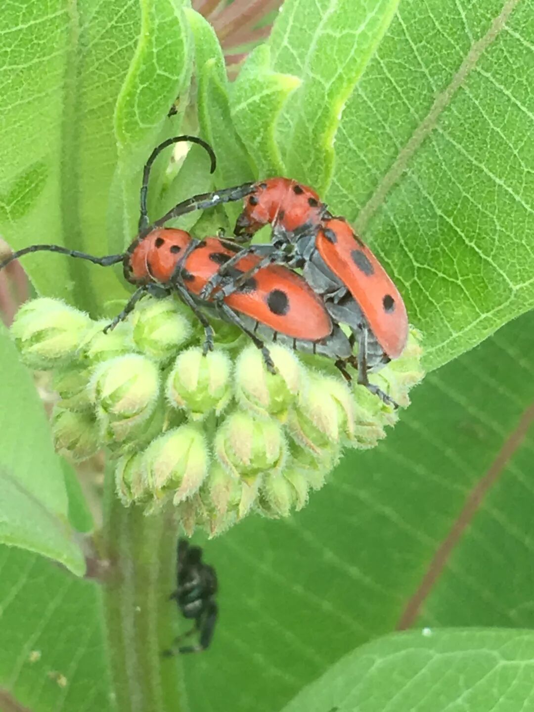 这一阵雨也很快过去了。我低头看土路边的野花,哎,它在干什么?一个甲虫趴在花蕊上。等我摘下眼镜细看,原来是两只甲虫,红红的背上,有几个黑色的圆点,两根长长的须角伸向了前方,一只正趴在另一只的背上,它身子微微一侧,伸出了两条腿,搭在了另一只的背上。 原来,它们正在交配。 繁衍生命,这一刻对它们实在太重要了,我靠得那么近看它们,但它们全不理睬,凝神做它们正在做的事情。倒是在它们旁边的一只黑蜘蛛注意到了我,赶紧爬开。还有一条绿色的小虫,使劲地钻进了花蕾深处,只留下一个绿色的小尾巴尖头。 小甲虫专心的继续交配。它们的小长腿动了一下,嘴上的须子也动了一下,然后,又都停住了。 我说了一句对不起后离开了,脑子不断地试图把两个概念连在一起:“繁衍生命”与“神圣。” 2018.8.6