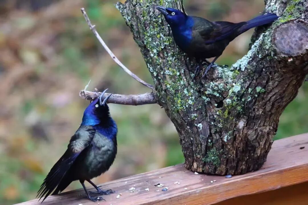 朋友甚至在后院的大树上支起了一个架子,挂着鸟食的笼子,于是就有许多鸟来吃食。