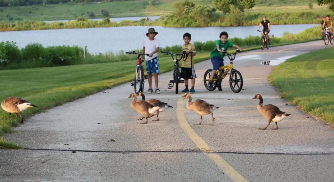 另一个感动我的镜头是,三个小男孩在公园里骑自行车,几只加拿大野鹅正好要穿过车道。于是,小孩子就停下了车,等着野鹅穿过马路。野鹅步履从容,慢慢地走过。