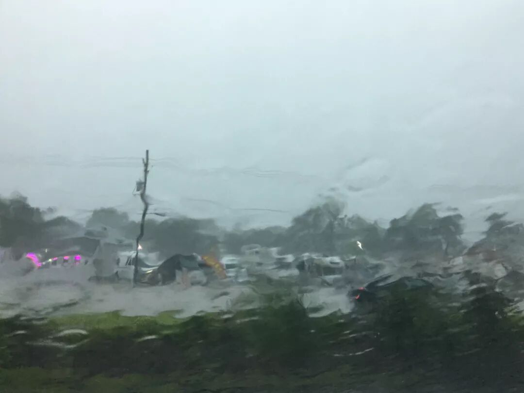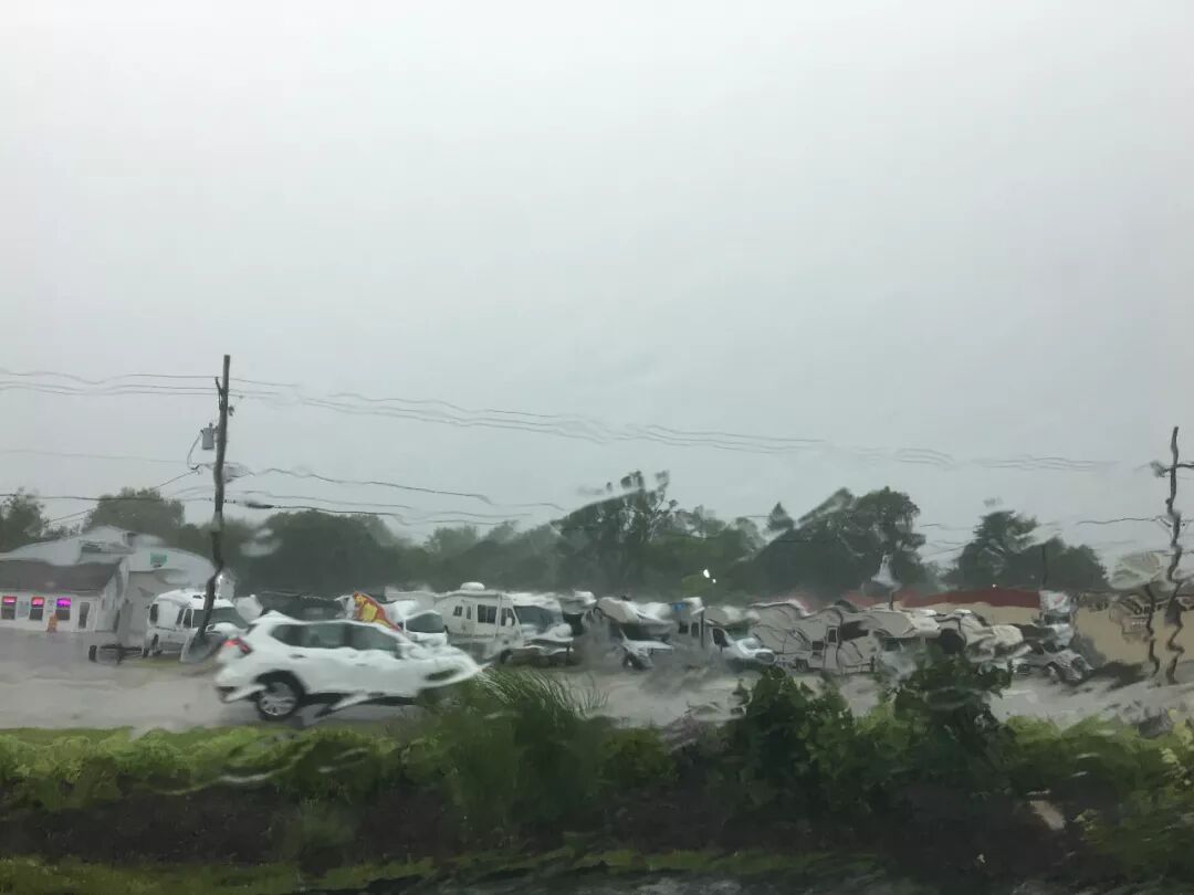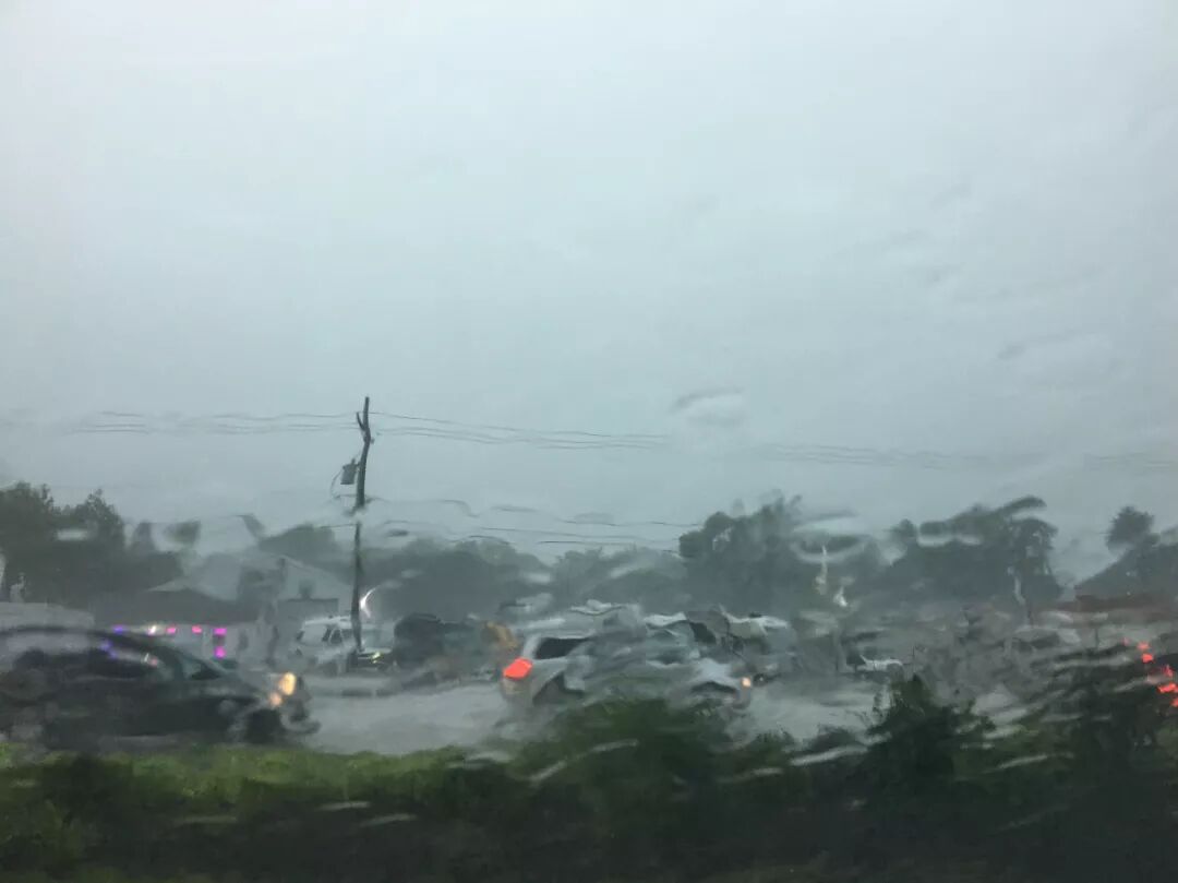 天漏了,大暴雨哗哗地泼下来,我把雨刮器拉到最快一档,但还是刮不干净,雨在车窗上成了瀑布,不止不休。 只能看到前面车的尾灯,两团红色。 主啊,帮助我镇静。 路边没有停车的地方。 开了五六分钟后,遇到了几个小店铺,我赶紧拐进去,停车。