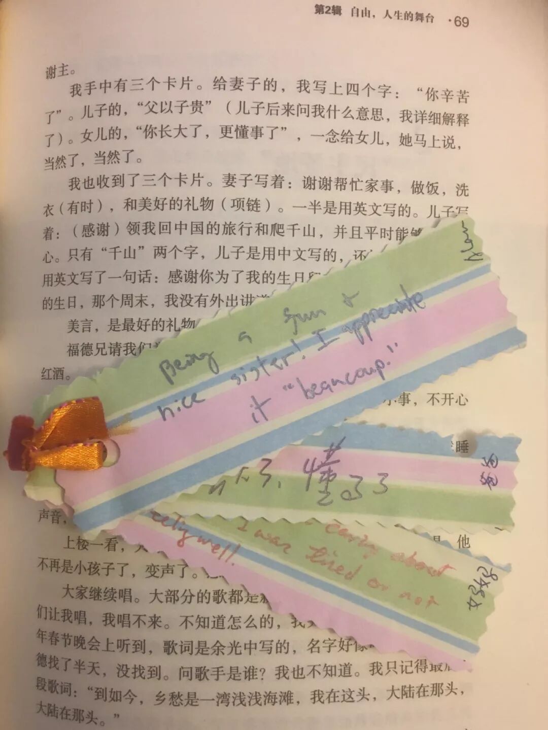 儿子写的是:“(感谢)领我回中国的旅行和爬千山。”