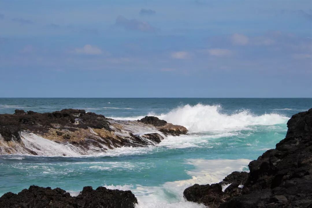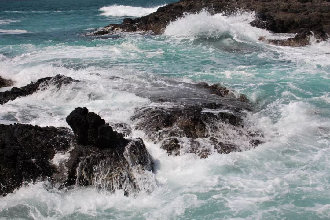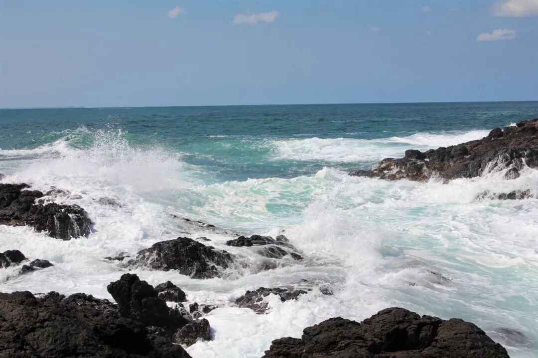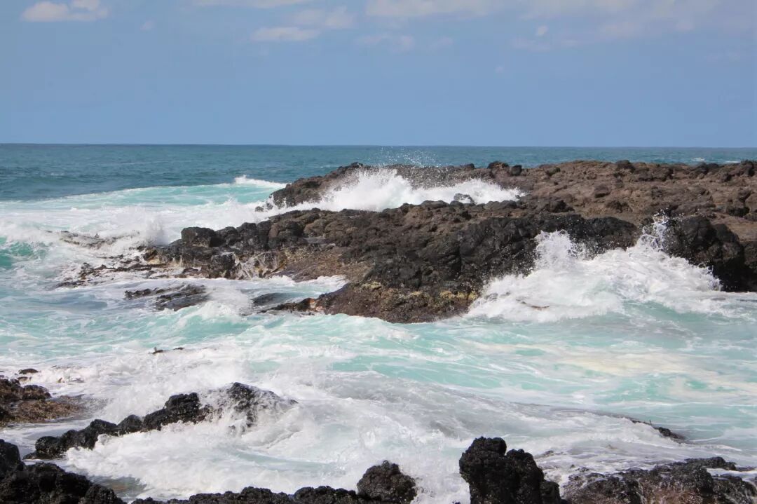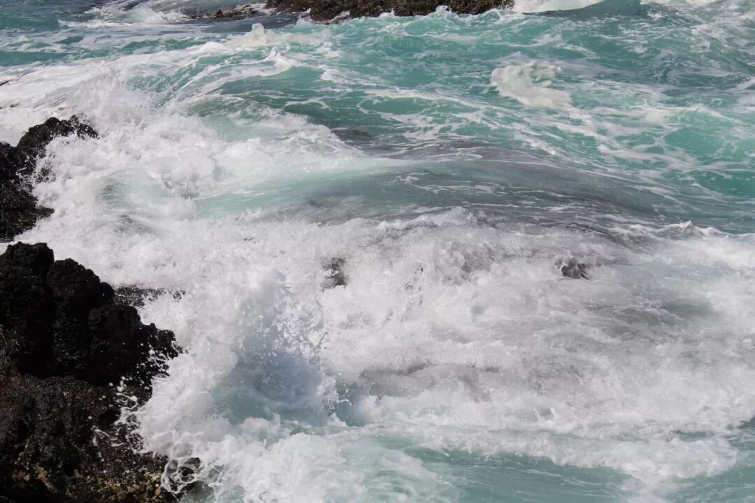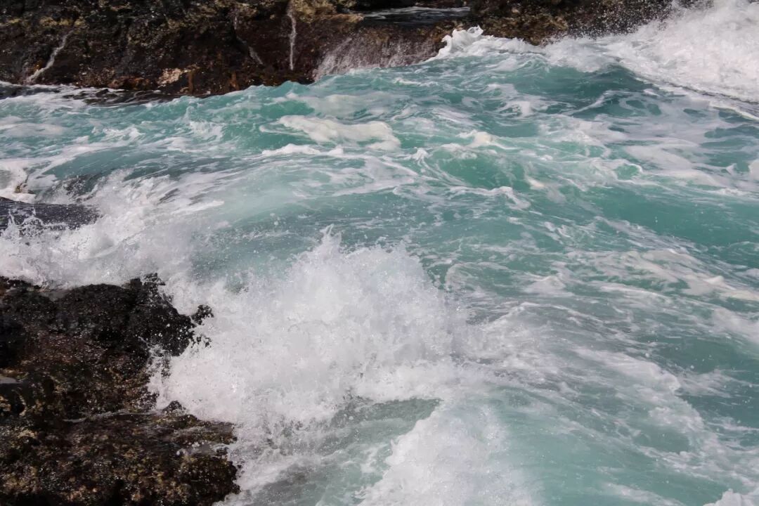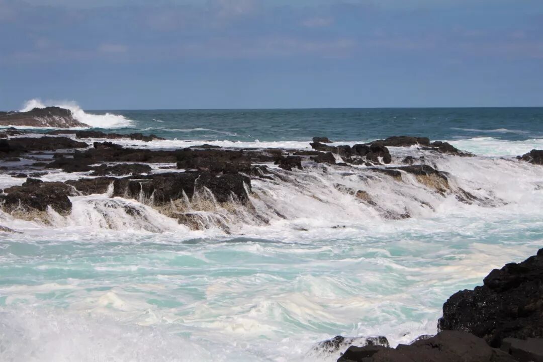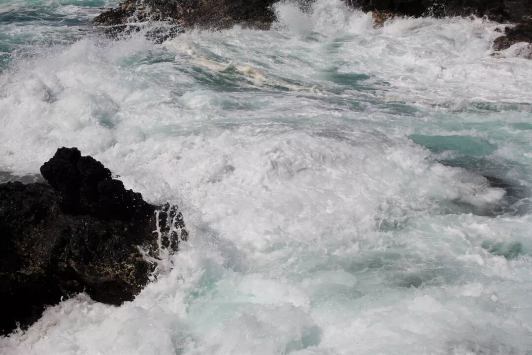 也许是因为黄弟兄在吧?我胆子大了一点,比上一次走得更靠前了一段,站在了更高的一块大石头上。就这一站,视野不同了。半个小时前我还以为海沟是不通的,挡住了从两头来的水流。现在看清楚了,海沟是一条,中间并没有隔断海水的礁石。 大水浩浩,这一边是,那一边也是,它们夹着洪荒之力而来,一次次撞击着岩石,哪怕身碎,也要飞流直上十尺、百尺,冲向云天,让千百万朵水花在蓝天下怒放。