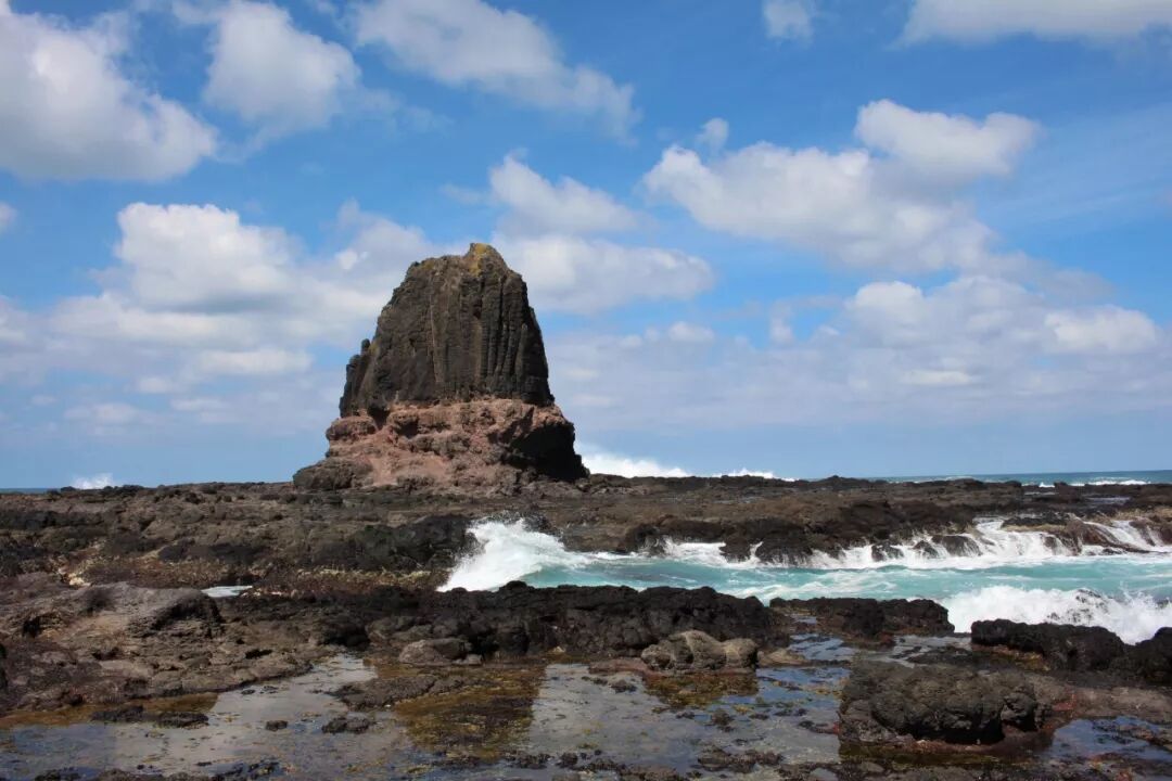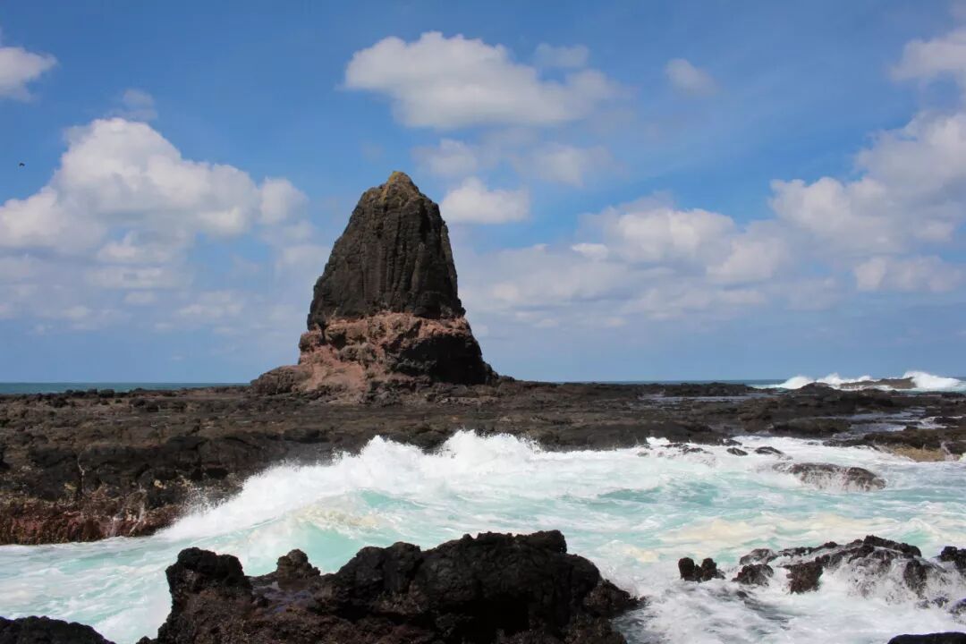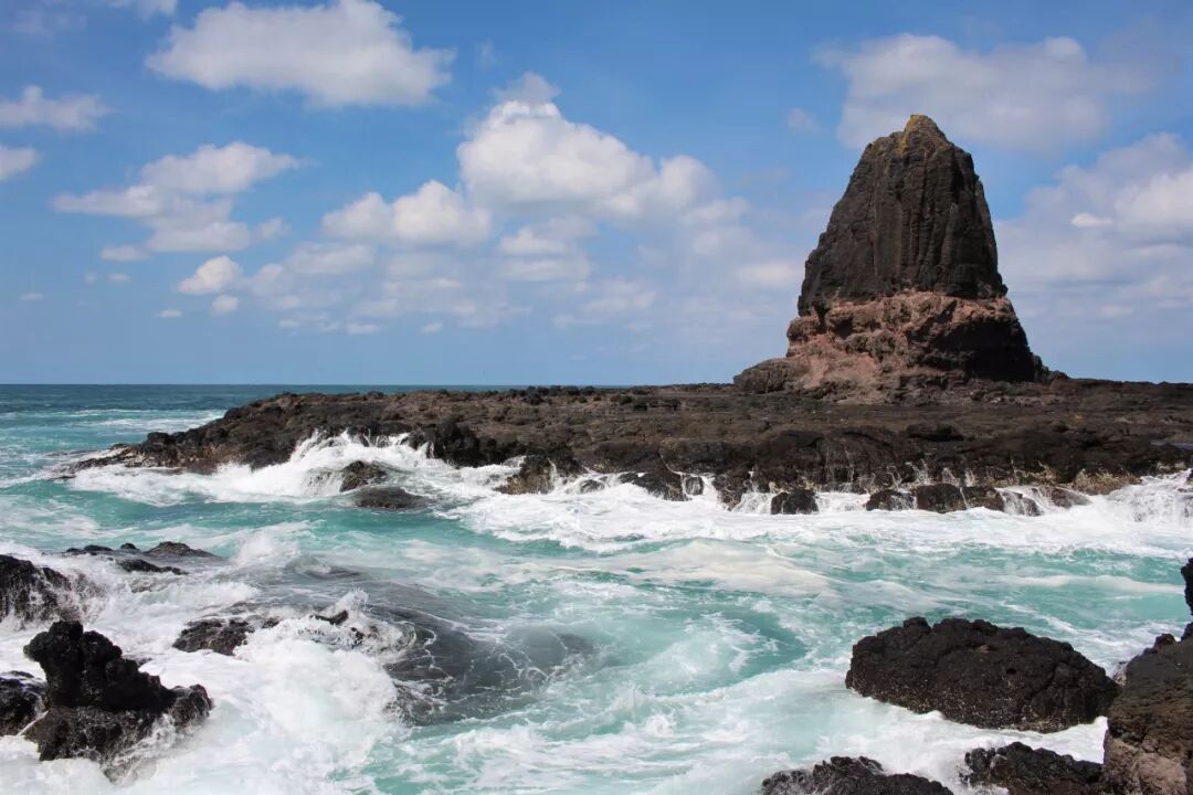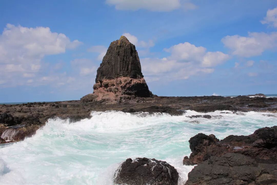 那块巨石出现在眼前,它前面飞起排浪,白花花的。真美。