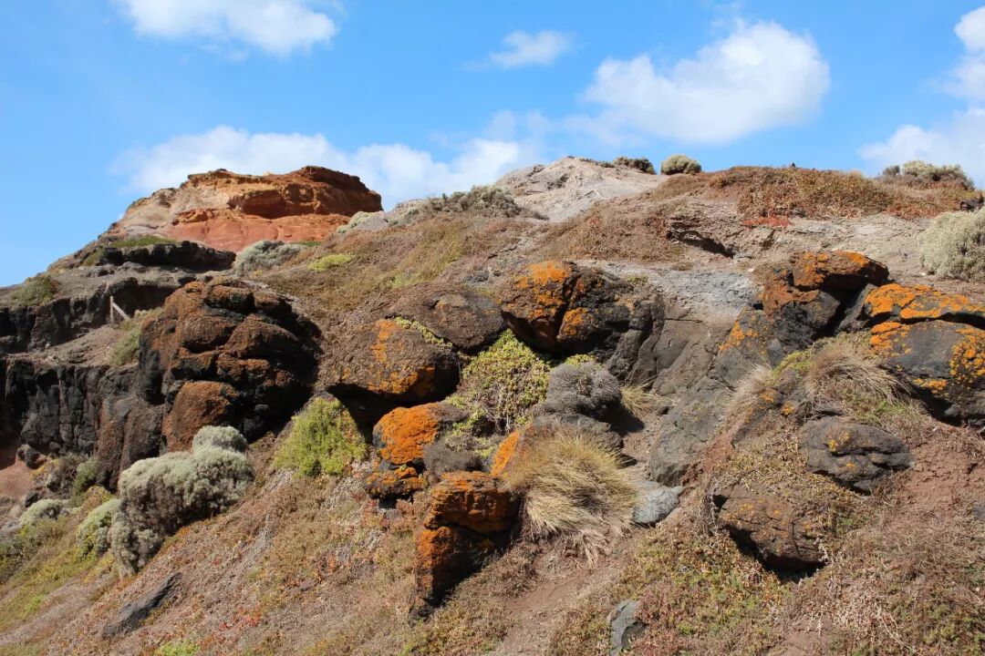 到头了,一个小山包,坡顶的植物红红绿绿紫紫,肉乎乎的。 两边各有一个小梯子,几个台阶就下到了海滩。顺左手边的台阶下去是一大片礁石,平平坦坦的,水面辽阔,好几个游客正在看水。右手边是一片窄小的乱石区,一边是山岩,远处有一块巨石,孤零零地立在那里。只有两个人下去,他们走了几步,就上来了。 去人少的地方吧。