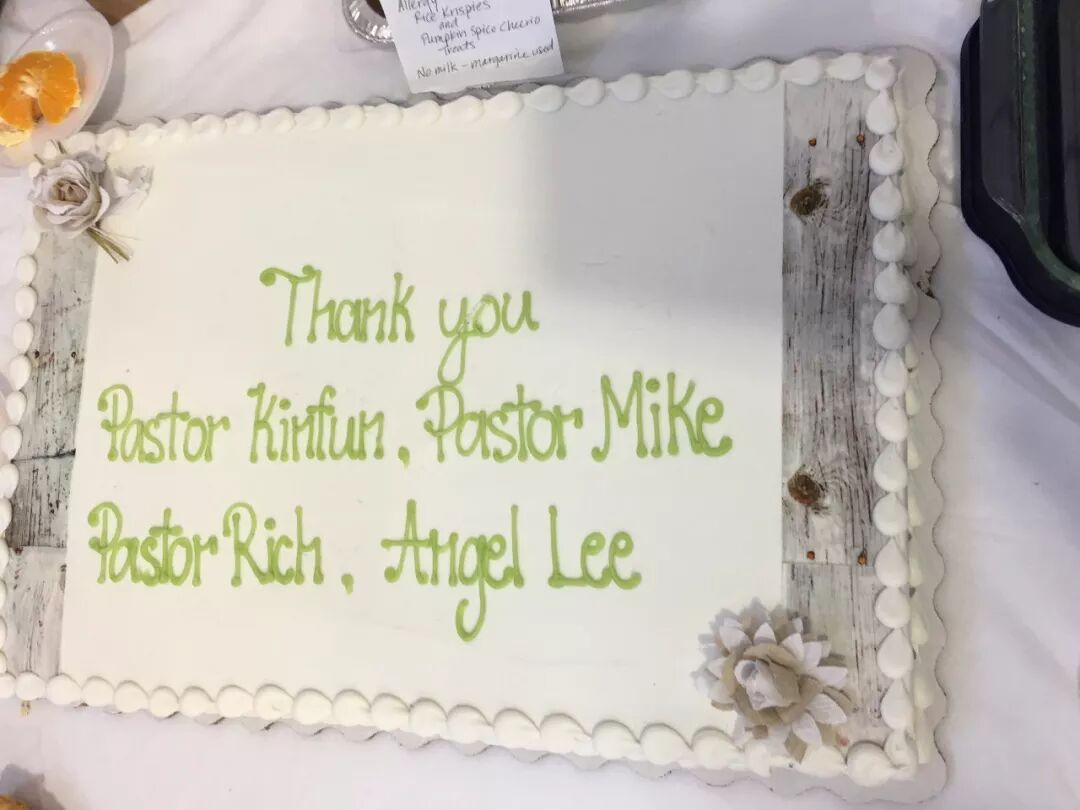 我正纳闷这是要弄哪一门子的惊喜,他又说:“是给牧师的。”噢,原来如此。 有夫妻相这么一说吧?上个礼拜天我刚走进教堂,就看见了陈安适的妻子杨伟向,她跟我打招呼后,就让我在招待台上放的感谢卡签名,写字。十月,是我们教会的感谢牧师月,好些其他教会也有这么特殊的一个月,感谢牧师。 以前在中国我从没听说有这么一个“感谢牧师月”,就是来到美国后也是过了很久才知道的,原来这是许多教会的一个传统,感谢主耶稣基督将好牧者——牧师赐给了教会的兄弟姐妹。 昨天主日学结束后,也是传统,我们教会中英文两堂的兄弟姐妹共进午餐,在吃饭期间举行一个小小的感谢牧师的仪式。