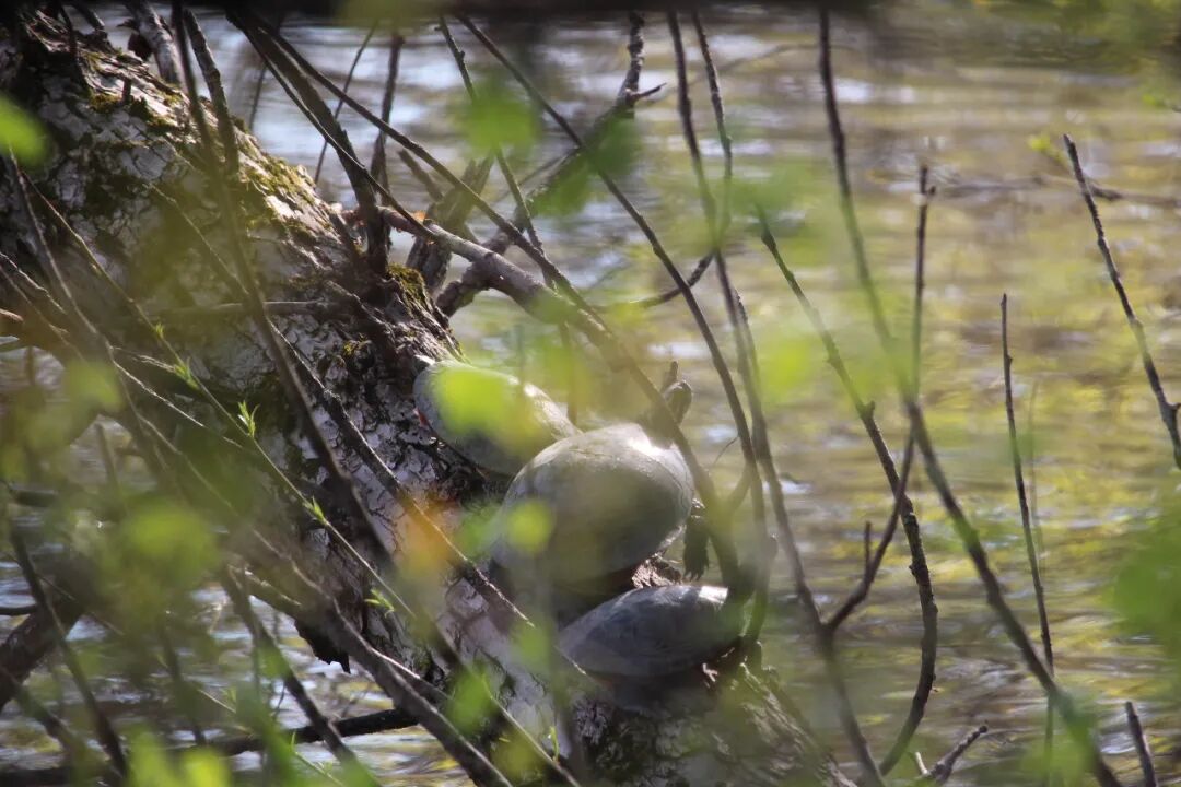 小池塘的另一端,靠着木板路,还有一棵大树,也是早早就倒了,也成了这些小动物的天体浴场。 不知道是怕羞还是怕人,它们老远地看到我的人影,或听到脚步声,立即跳进水中,“扑通扑通”的,也有的没准备好,滚进去的,还好,底下就是水,不会摔断脖子的。 不管怎么样,到时候了,出来吧。