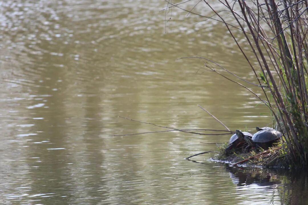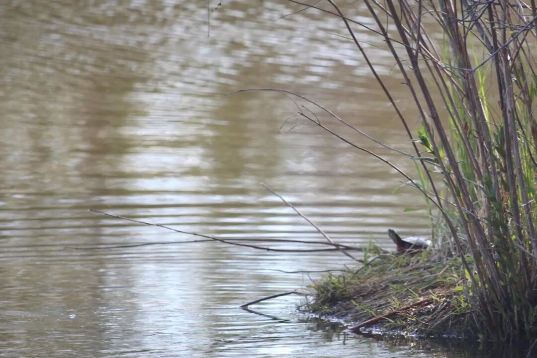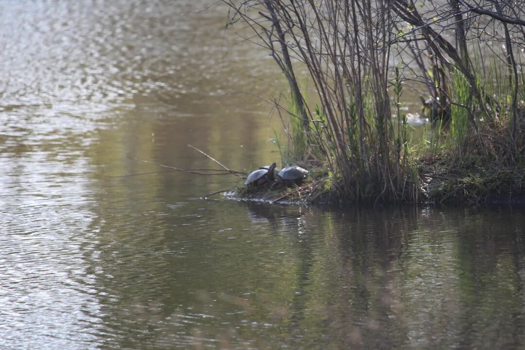 离池塘边上十来米,有一棵大树和几个灌木,成了一个小岛。大树大概是被雷劈了,倒下了一大截在水边。 等到小王八或乌龟爬到上面晒太阳时,春天就到了。