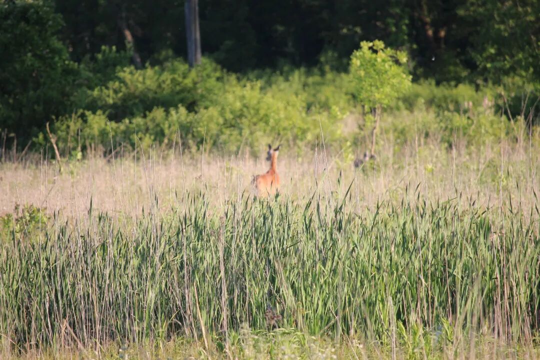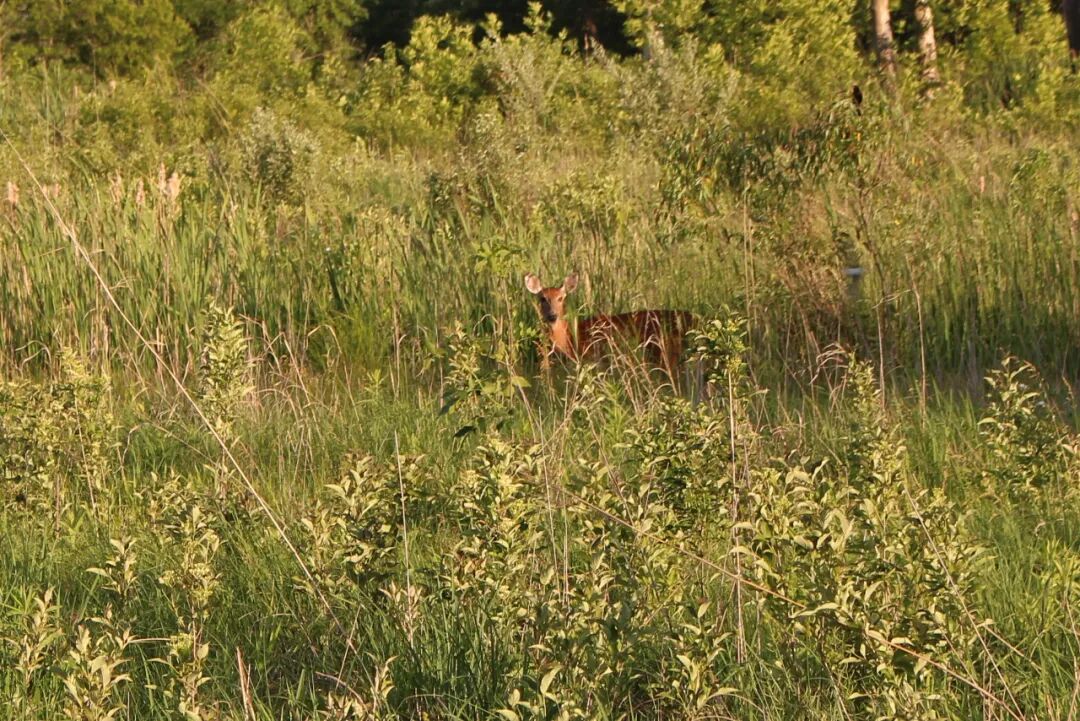 自从野地里冒出了绿草芽,我就盼着野鹿们能回来,到这里吃草,漫步,看看我。等了快俩月了,野花开了,野草抽穗了,它迟迟不来。今天,鹿儿终于回来了。 是小鹿,这称呼对我来说是多么亲切。 小鹿不知道疫情,似乎不懂在被限制了社交距离后,人多么渴望与动物交往。它看了看我,又低下头,慢慢地吃草。