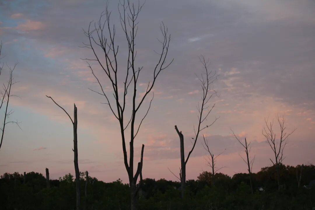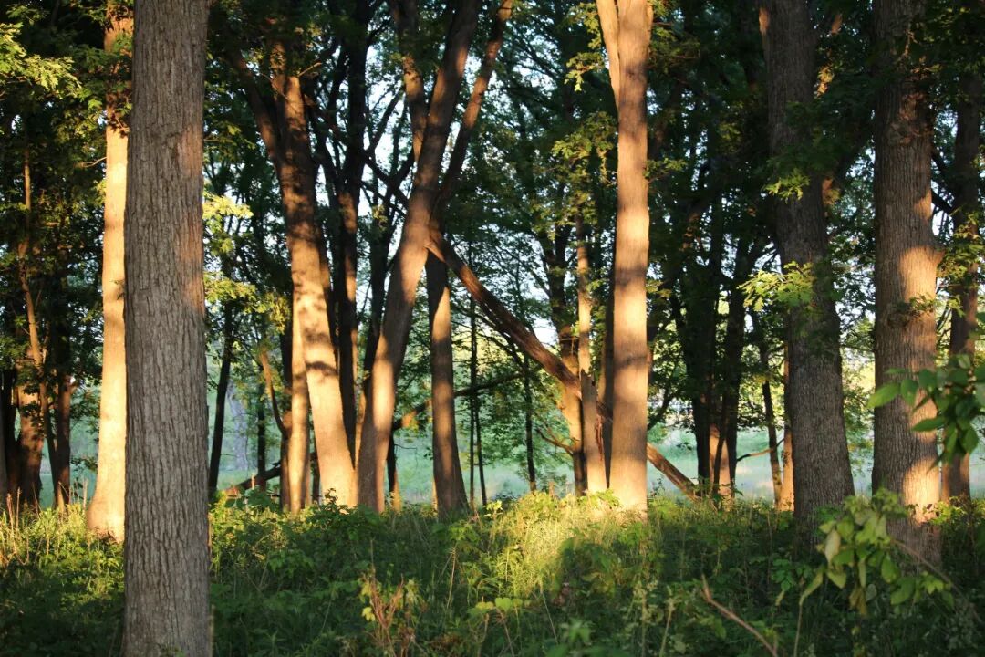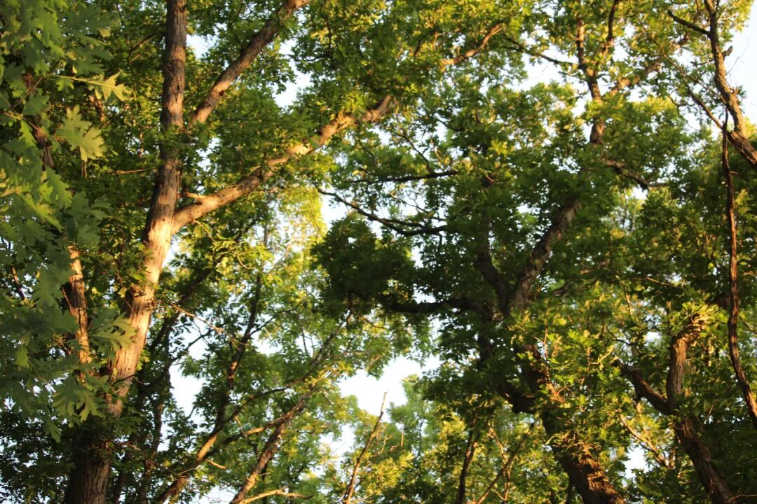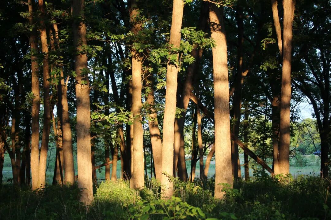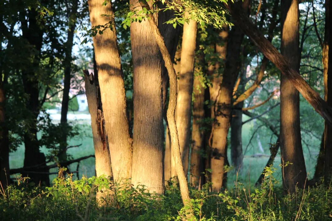 出了林子又是一片空地,长满了野草。 夏天到了,林子中的大树撑起了一个个绿色的桂冠,遮住了天。深秋时,工人会来修整树林,砍掉杂树,让大树之间保持社交安全距离,也为了保护居民的安全,方便看到林子里有什么。 林子里有鸟儿乱飞,野兔子乱跑,小松鼠则爱顺着树干上上下下,偶尔也能见到几头野鹿在林子深处。还有野花,随意地开放。