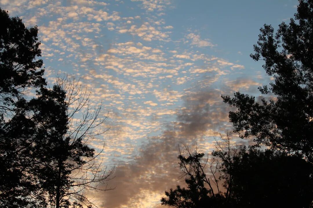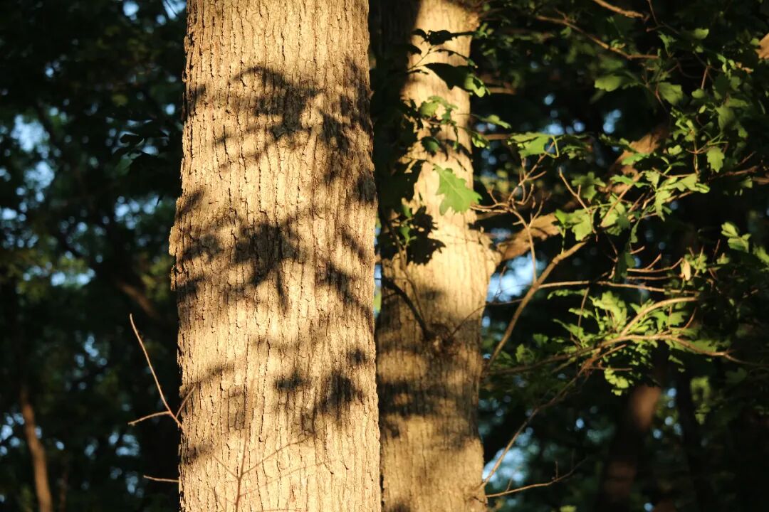 天突然大亮,突破浮云,太阳把大光射进了树林里,大树干立即都亮了,闪光了。一个大树干就成了一个金色的柱子,流淌着金光。 我迷住了,赶紧拍照。 那两个人声也不见了。