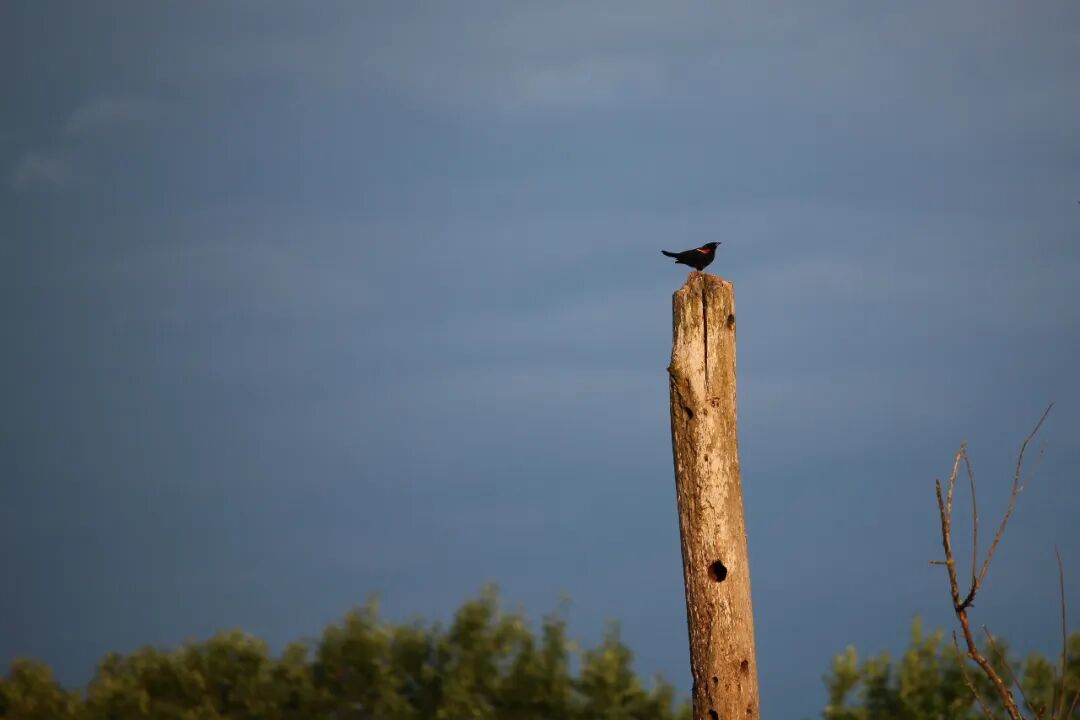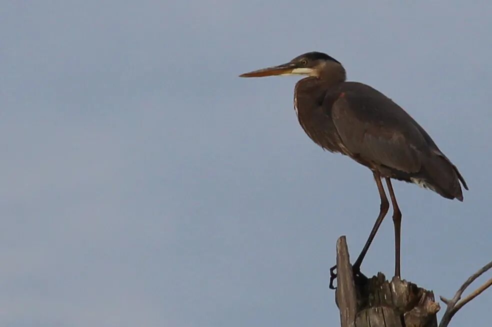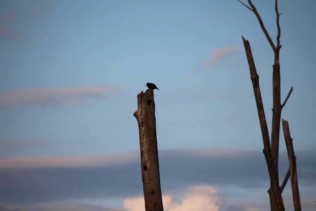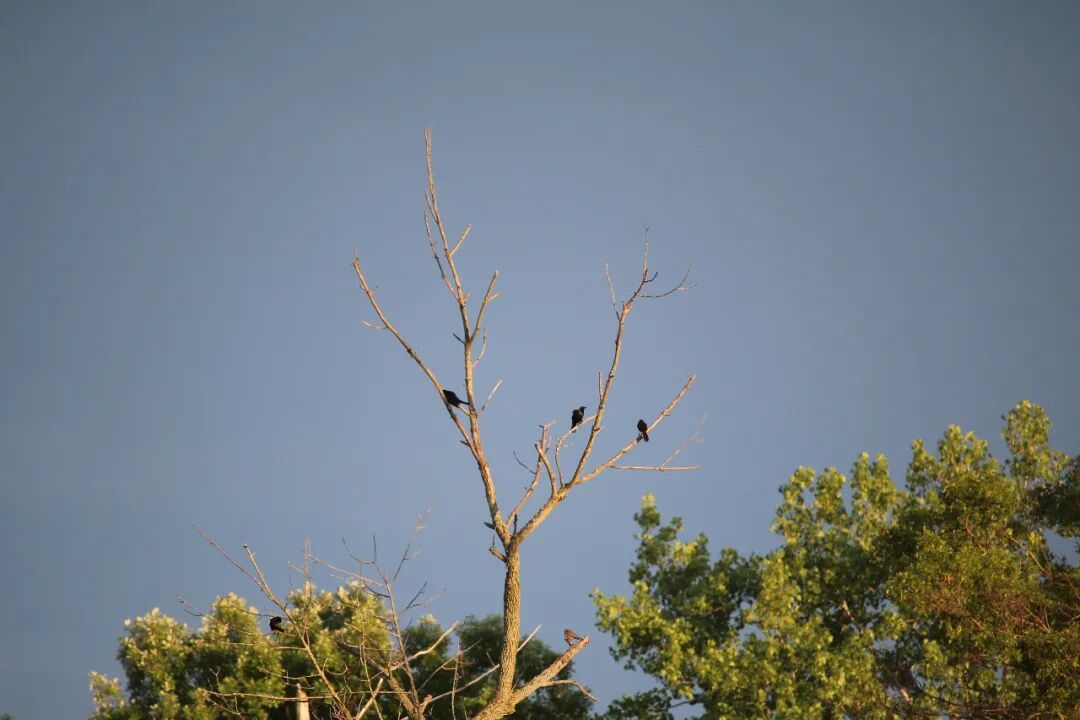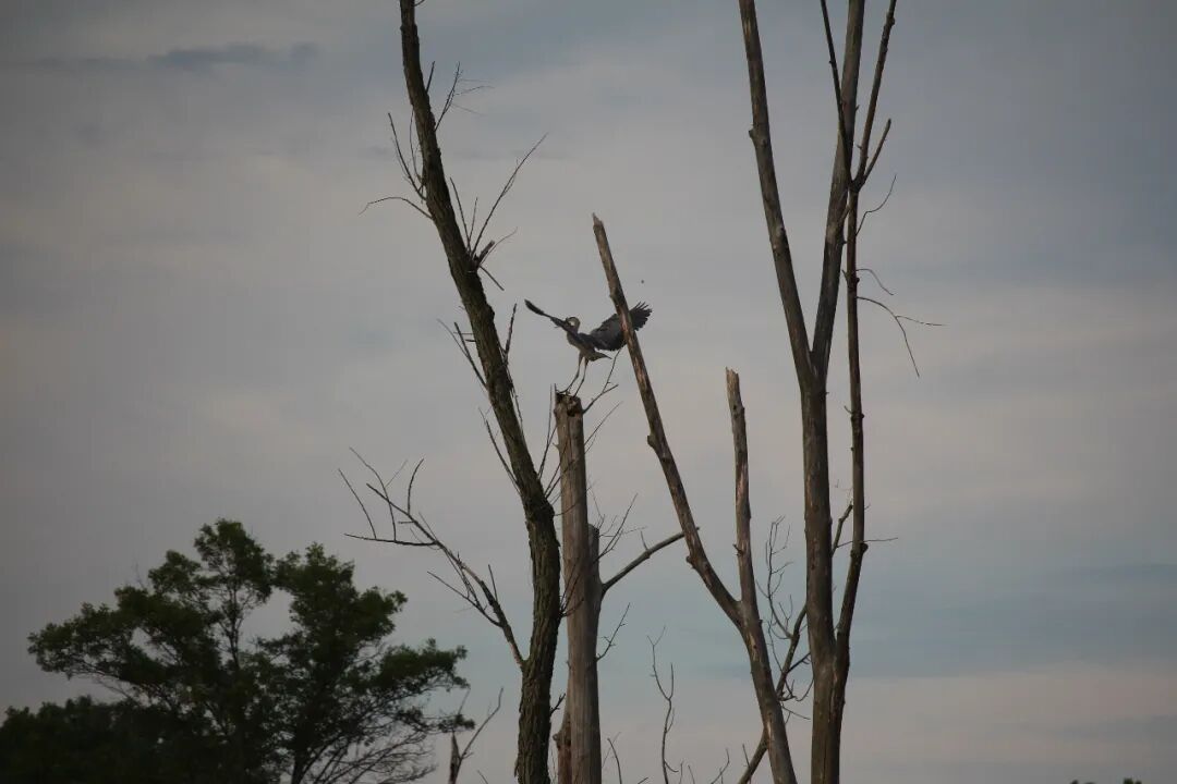 从天边飞来灰色的鹭鸶,站在枯木上。