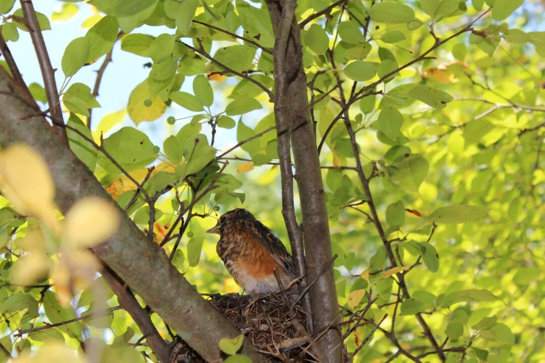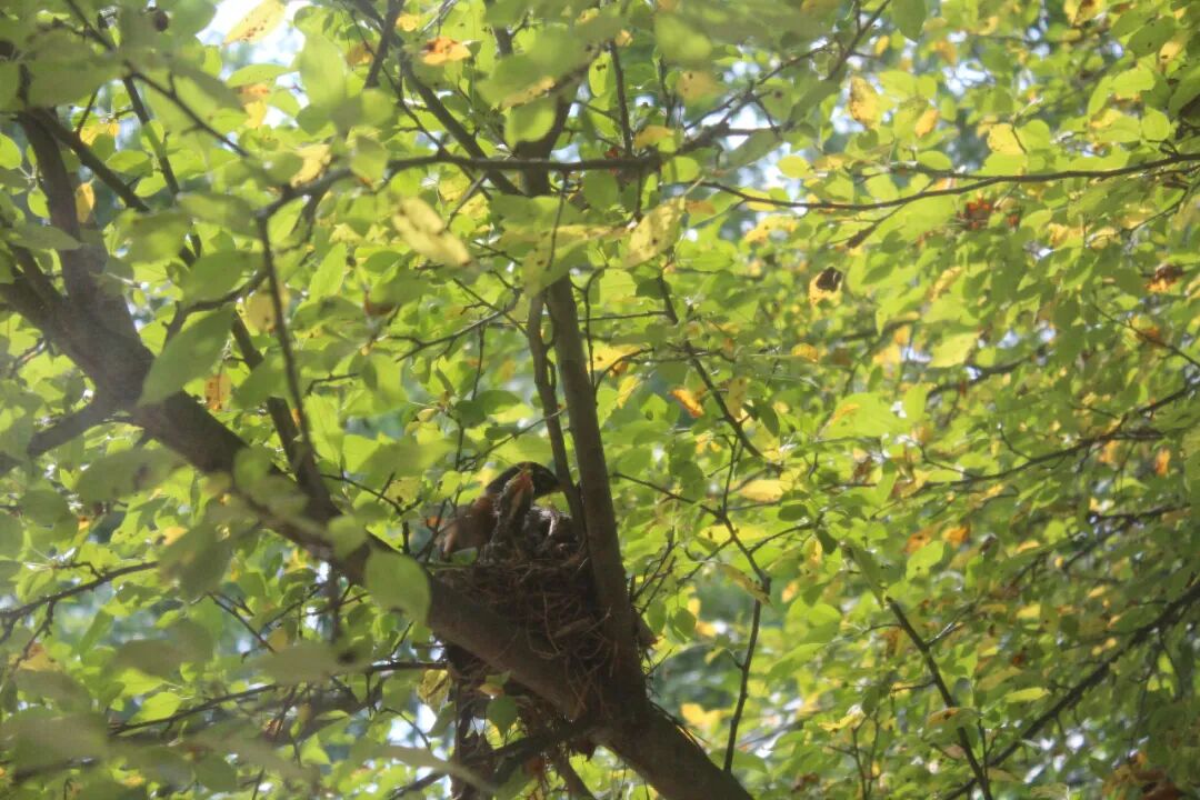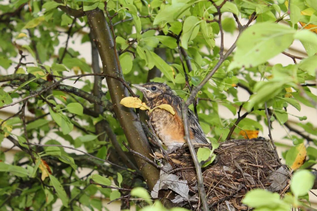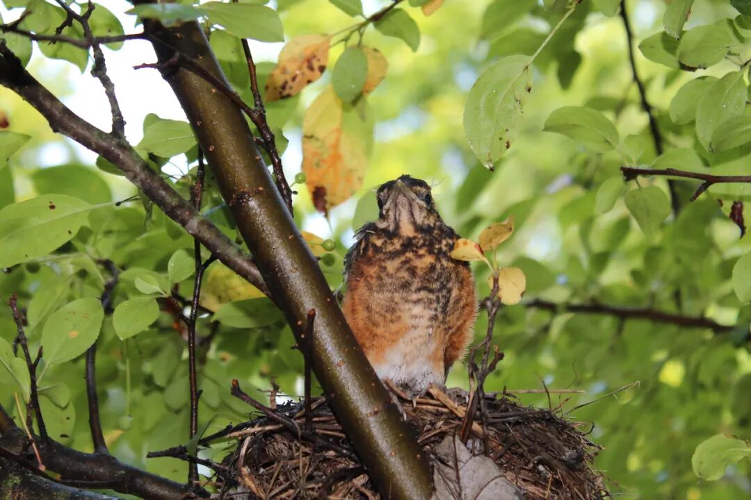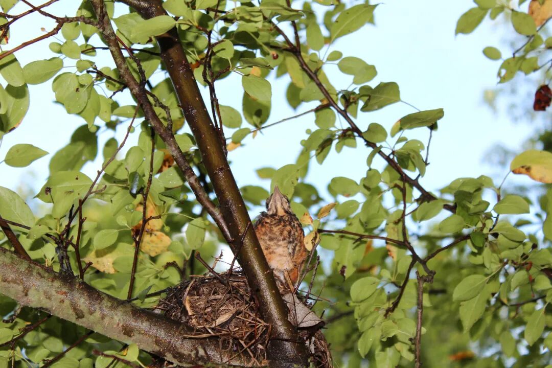 屋后有棵樱桃苹果树,有一天无意间我发现树杈子上多了个东西,细一瞧竟是个小鸟窝。一只知更鸟正站在窝边。见我在屋子里看它,知更鸟叫了两声后飞走了。过了一会儿又飞回来,守着窝。看我退后了几步,它便卧在鸟窝上,整个身子把个窝捂得严严实实。 原来是知更鸟正在孵小鸟。 好奇,第二天早上我走到树下想看看有几个鸟蛋,还没等我靠近鸟窝,老鸟一下子就窜起来,“嘎嘎”地大叫,边叫边飞,一会儿从我眼前飞过,一会儿从头顶,叫声声声尖利。 它是在吓我,赶我走。