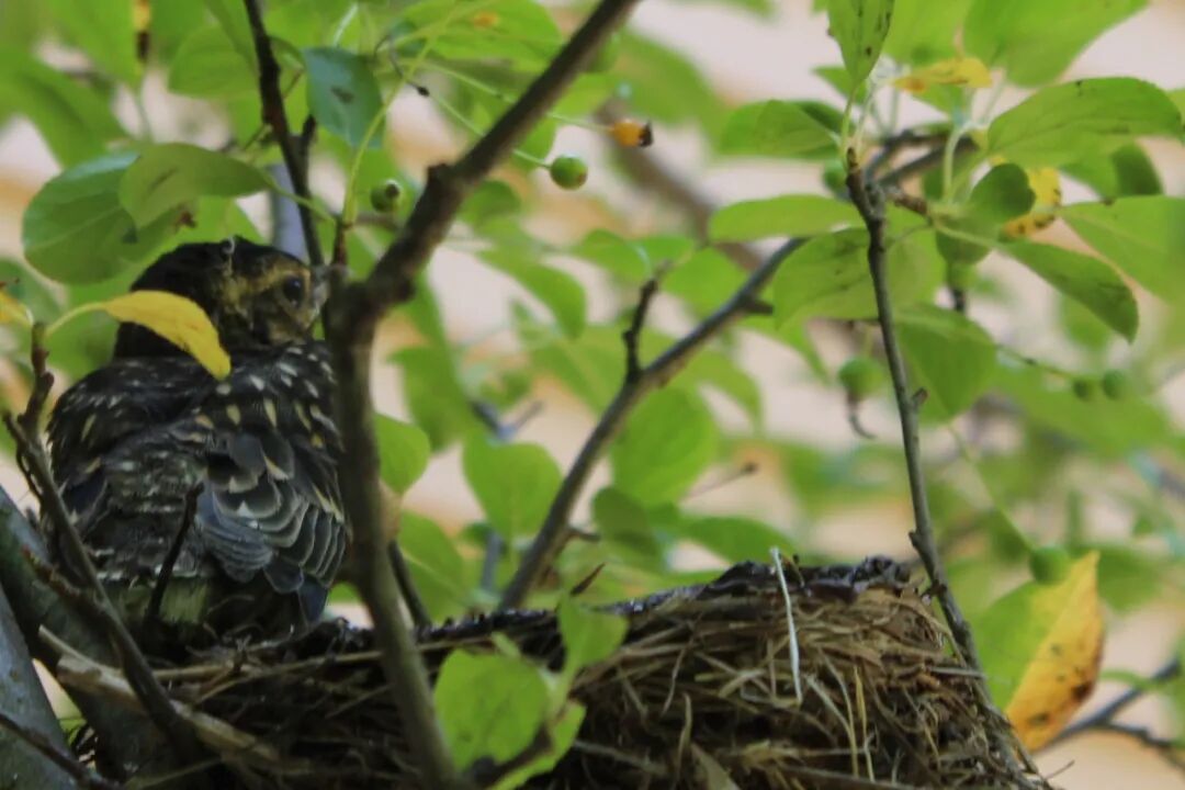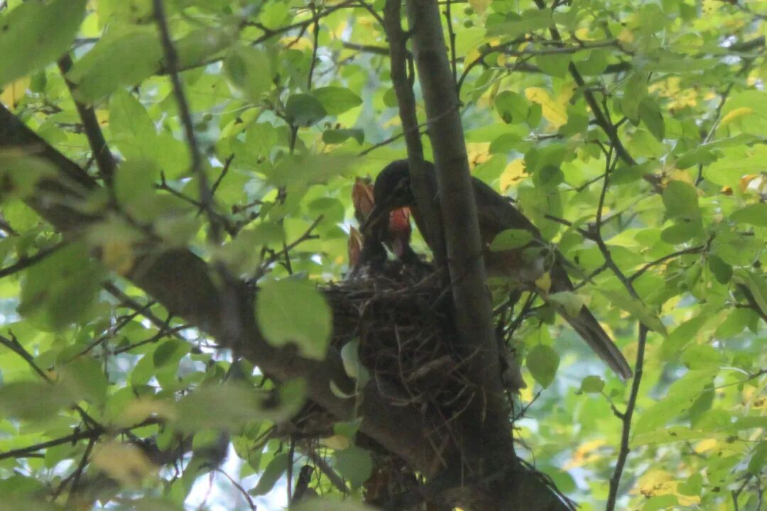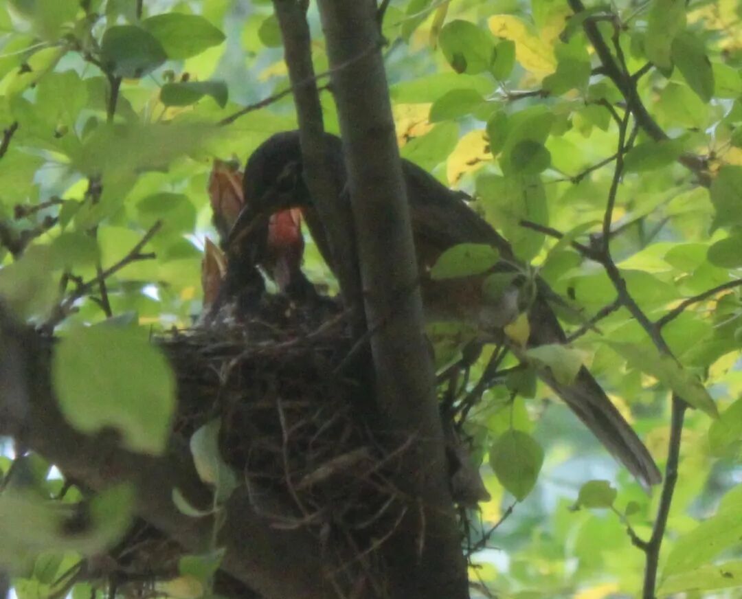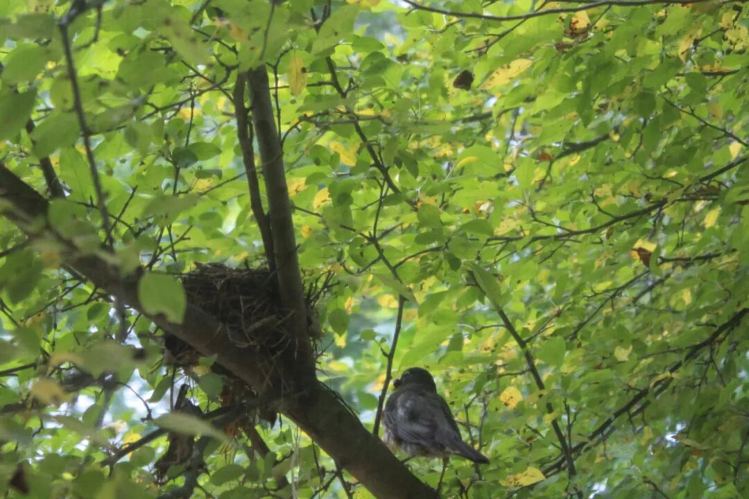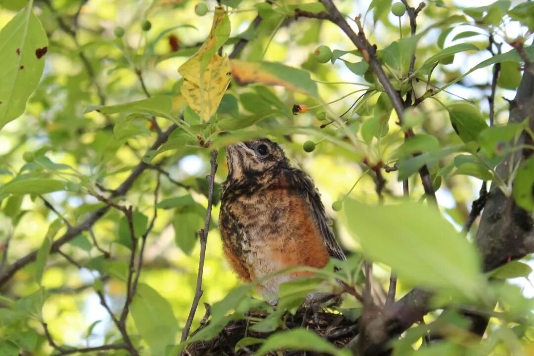 屋后有棵樱桃苹果树,有一天无意间我发现树杈子上多了个东西,细一瞧竟是个小鸟窝。一只知更鸟正站在窝边。见我在屋子里看它,知更鸟叫了两声后飞走了。过了一会儿又飞回来,守着窝。看我退后了几步,它便卧在鸟窝上,整个身子把个窝捂得严严实实。 原来是知更鸟正在孵小鸟。 好奇,第二天早上我走到树下想看看有几个鸟蛋,还没等我靠近鸟窝,老鸟一下子就窜起来,“嘎嘎”地大叫,边叫边飞,一会儿从我眼前飞过,一会儿从头顶,叫声声声尖利。 它是在吓我,赶我走。