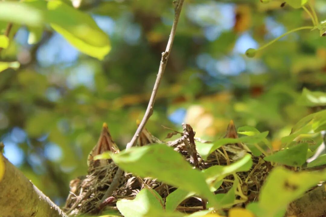 从十四日到二十三日,还不到十天,小鸟窝里探出了一个小头,露出一撮灰绒绒的细毛,接着,又一撮细毛,小鸟出生了!在我的惊喜中,第三个小头也探出来了。 新生命。 母鸟飞走了,公鸟飞过来,站在鸟窝的旁边。十来分钟后,母鸟飞回来,嘴上衔着一条细细的小蚯蚓,它低下头,把蚯蚓喂进孩子们的口中。喂饱小家伙后,它卧到了窝上。那时,公鸟想必是在草地花丛间寻找孩子的食物。 过了两三天,雏鸟的头伸得更高了,几乎可以看到整个脖子,乳黄的小口在下午的强光下金灿灿的,一张开,就好像一个小漏斗,三张凑到一起张开,就是古代的一个金尊。 母鸟刚一站到窝边,三个小口就张开了,有高有低,一边张,一边朝着妈妈动,等着妈妈把美食填进自己口中。妈妈喂过它们后,站在窝边不动,眼睛盯着远方。也许,它像我母亲当年想的一样,这群孩子咋这么能吃啊?肚子总是填不满。 母鸟飞走了,到地里觅食。她刚一离开,公鸟立即飞过来,嘴上也是衔着一只蚯蚓,或青虫。立即,三只雏鸟又都把头全都伸出来了,乳黄色的小口张得更大,小口的那道边上,还嵌上了一道金黄,肉乎乎的。 几天后我看清楚了,靠着鸟窝南边的那个鸟宝宝,总是把头伸得最高,小嘴张得最大。不由得我几次说,小家伙,别这样!我为鸟妈妈代言,有诗为证: 乖宝宝,别抢 妈还要喂两个小弟弟。 一天又一天,从早上到黄昏,鸟妈妈与鸟爸爸交替地照顾孩子,你走,我来,来时嘴上大都叼着好吃的。随着孩子长大,它们飞得更频了。偶尔飞回来嘴中什么也没有,就是想低头看看宝宝们,它们嘁嘁喳喳几声后,安静了,昂起小脖子注视着父母,而父母的眼中充满了慈祥和安宁。