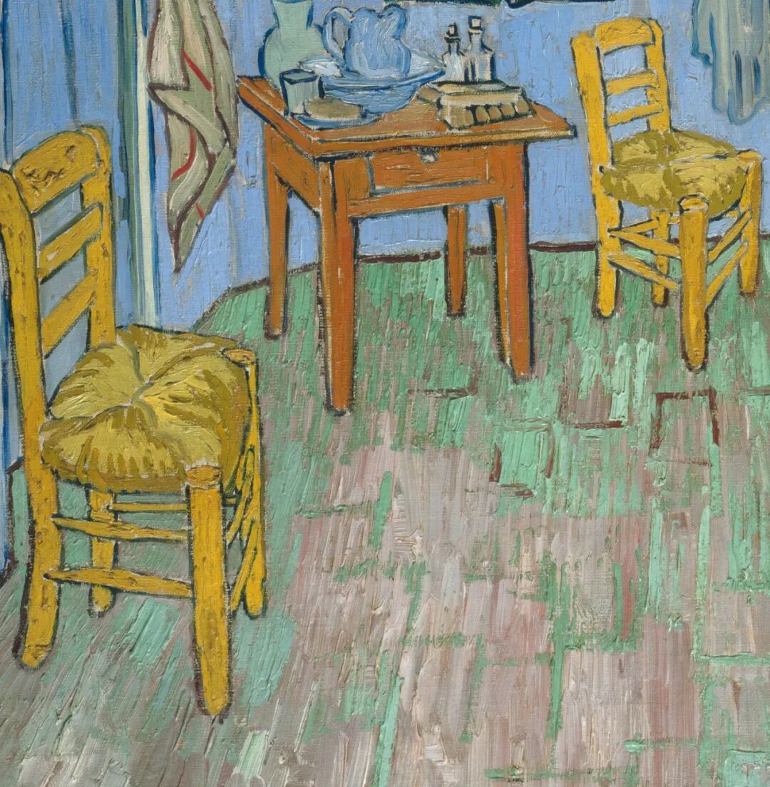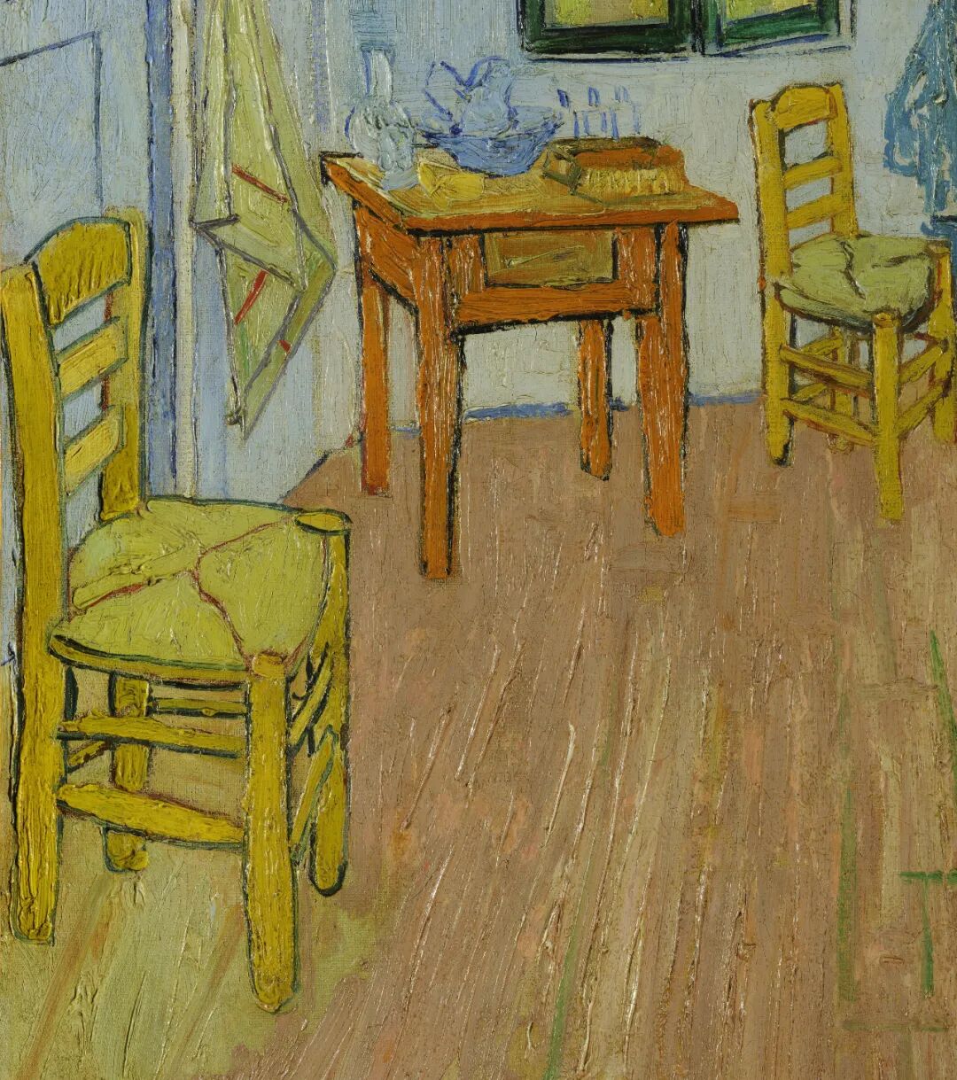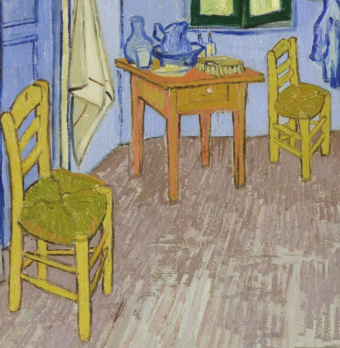 (1888年10月创作于阿尔勒的《卧室》第一版的局部)