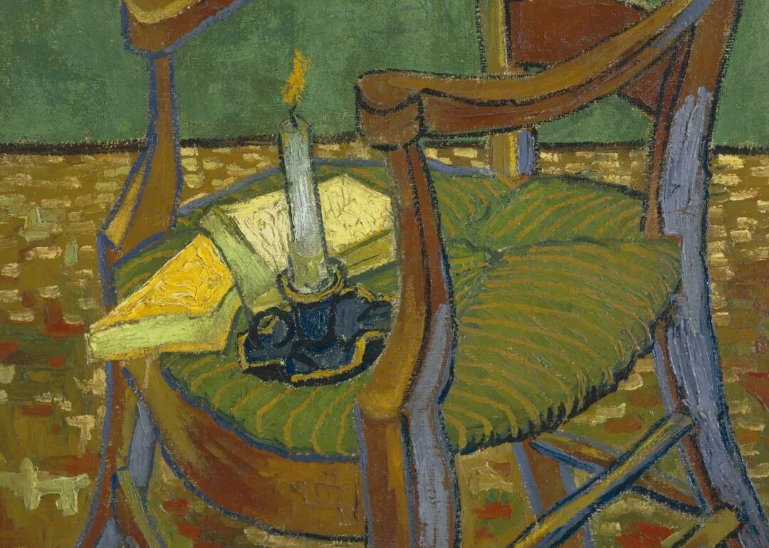 然后是高更的扶手椅,是红色和绿色的夜晚效果,墙和地板由红变绿,座位上是两本小说和一只蜡烛,是用厚涂法在一块帆布上所画。”(1888年11月23日,致提奥。)