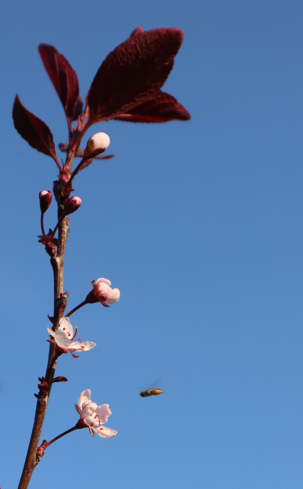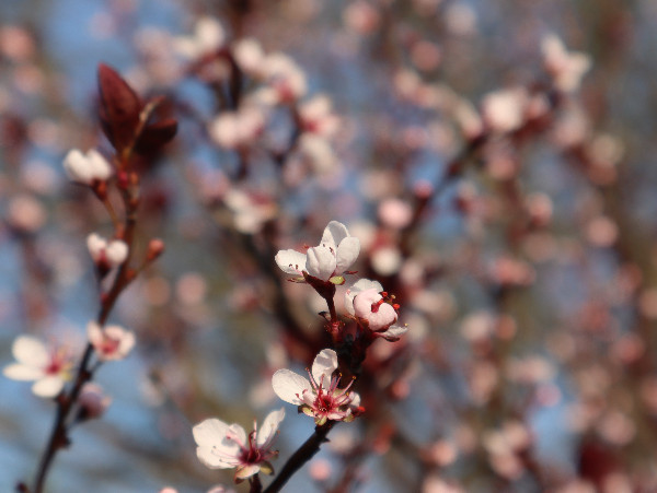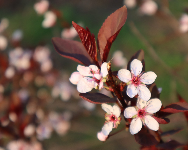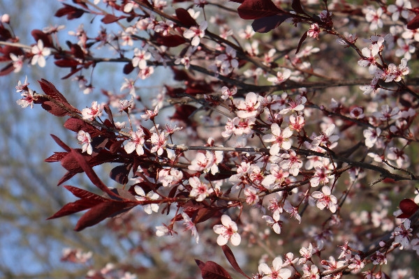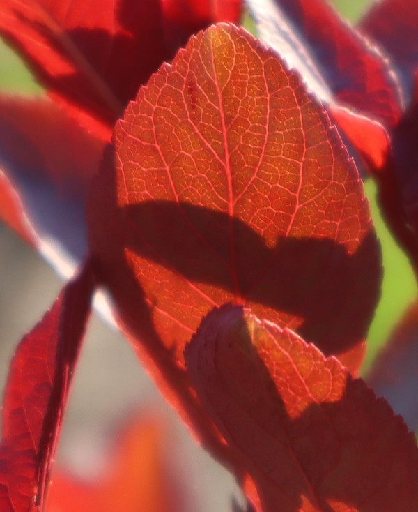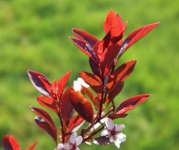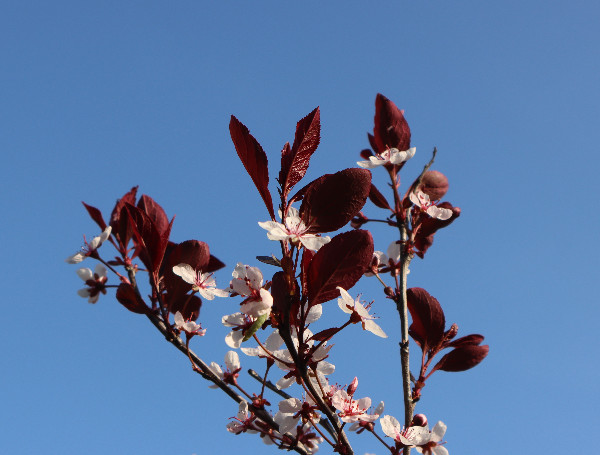 都过去半年了,还是忘不了那一树树紫红色的小花,它们开在邻居家门前屋后。隔着绿草坪看,有些朦胧,初见时是点点深紫,红紫,后来,紫红色的花蕾放开了,是一团团粉白,中间根根红丝,是花蕾。但叶子,总是深紫色。最近我知道了,它叫紫叶李,拉丁学名:Prunus cerasifera 'Atropurpurea' ,英文叫Purple Leaf Plum,中文别名:红叶李、樱桃李 那一日散步,走到了另一个小区的公共绿地旁,见几棵盛开的紫叶李就在绿地边上,正是那家的屋后。于是,我走到了花树前,它大高个,一米七八高,从地面一尺高起分出许多枝枝杈杈,每一根枝子上都开了许多粉白小花,树叶深紫。 看时拍照时我一再想,它们为什么令我感到这么亲切?想来想去,想到了一床被面,那是我十来岁时盖过的被子,它上面就是这么多小小的碎花,紫色的,深紫,浅紫。那是单单属于我的被子。有了它之后,再也不用像以前那样了,和哥哥合盖一床被子,夜里一次次冻醒,被子全被哥哥拽过去了。 哥哥也被冻醒后,说被子都叫你拽过去了。 绿地旁的紫叶李花正盛,颜色由紫变粉白的小花,让我感到挺温暖的。紫色的叶子不大,但有些挺拔,憋着一股劲。转身拍照时,紫叶变色了,逆着大光,它的背阴面变得通红,是深红,亮红,叶脉根根线线凸显,粗粗细细,弯弯曲曲,构成了城区地图,又像人体的血管。 当年妈妈拆下被单被面,让姐姐和我们几个兄弟到大白河去洗。洗好了,铺到河岸的沙石上晾晒,如果我逆着光,会看到被面也有这样美丽的城区地图吗? 2022.11.10 深夜完成此文。 照片摄于5月11 日