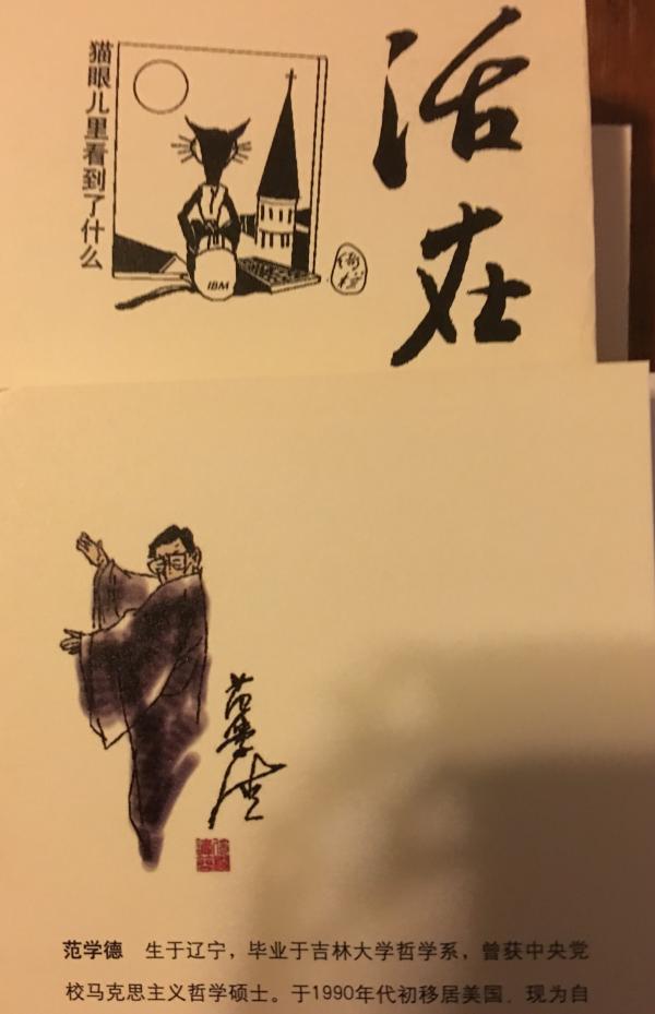 范学德按: 饕餮兄的这篇文章,是我到《猫眼看人》上写作九个月后写的,这是平生第一次有人为我立传。他以“猫眼大侠”为题,用文言文写了一系列妙文,我也荣幸地汇入他的笔端。 倚栏读简作画 兄还画了一系列的漫画。 盖网络之无远弗届,寰球为之盈缩,天涯无非咫尺,佛曰:肉身之赘弃之可也,得道之悟无非魂魄,是以借网络而交通者,无乃乎心智之交也。然则肉身之难弃难离,又非一日之功者也,犹之乎范先生学德者,神交乎网络,纵论乎无极,然则先生之肉身赘赘乎米国,隔大洋而通达心智,倒昼夜以游弋江湖,此诚红尘之羁縻, 无可如何焉耳。 夫范学德者,国朝六年生人,北地盛京人士,无产工人之苗裔,红旗阵营之纯种,总角开蒙则先帝语录育化之,弱冠青春则先锋桂冠荣膺之,历练于广阔天地,壮志乎四海凌云,二十九年,入太学(注1),习格物致知之诡术,得似是而非之糠疵。出太学,入官场(注2),春风共马蹄同驰,宦海并波诡齐来。当其时也,先生倘或角力以搏,则倾轧沉浮数载,未始不可品级渐高者也。 然则先生切齿于龌龊,不屑于苟且,遂尔远引高登,举进士于京师,入廷枢之椿坊,国子监研习资治之通鉴,颐和园潜修国祚之无疆,得中外治世之秘辛,获古今衰亡之缘起。以先生苗裔之纯正,复有国子监生员之金牒,则外放封疆大吏之镇抚,无乃乎水到渠成耶?未也,弃官而执教也,盖因先生此际,或有别调之另弹焉尔。 四十年以来,先生之著述多不合于时论,言动招忌,默察引疑,乃于四十二年省亲于米国,挥手从兹去,故土伤别离。 盖米国,大邦也,强国也,上帝垂注,基督移居,人民尊仰之,官绅畏服之,故先生入得彼邦,使者接踵劝化,先生勃然,祭马教之大纛以御之,出先帝之宝典以镇之,挥悟空之大棒以战之,如是者三载有余,竟尔不敌,渐次气馁,再而衰,三而竭,终乃弃旧迎新,举头三尺换神灵,荡涤半生子虚经。 网络江湖乃无界之土,先生身负福音广播之己任,乃独行于故土之江湖,“天涯”劝化遭驱逐(注3 ),“猫眼” (注4 )留饮且止步,先生乃化福音于无形,传大义于微言,专一摹写米国众生之世态,如实写真邻里匹夫之日常,入其眼者入其文,闻其声者文其声,年余以来,娓娓者、切切者、嘈嘈者、如如者,竟尔累累百余篇,观者会心以笑,赏者击节以叹,虽辱者寻衅以詈,然先生怡然以对,无恼无戾,至通至达,英雄之既往仿佛前世,学德之今生已然学得,——其行状类乎此也。 论者或谓:范学德之文论,必前恭而后倨者也,其传教之宗旨必后而显,拭目而待可也。余则谓:此乃诛心之论也。范学德之弃其既往而入其教,无乃乎其既往之旧教崩坏哉?旧教之崩坏,国之幸也,民之福也。范学德之文论,一尘一菩提,一花一世界,诳语绝,虚言杜,心之声,腑之感,以此为传教,则此传可侑,此音可听者也。以是观之,则范学德亦大侠者也。