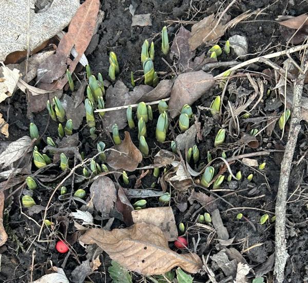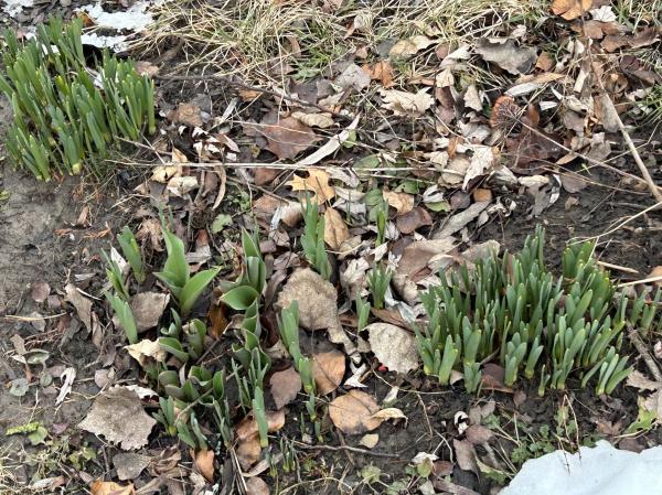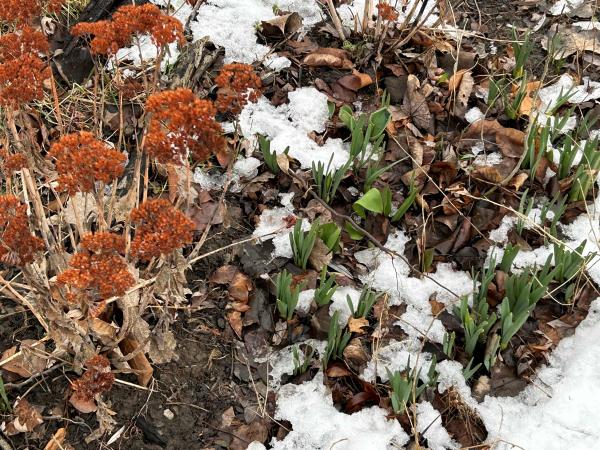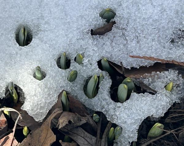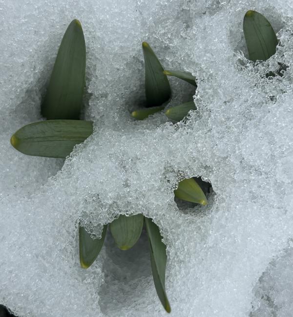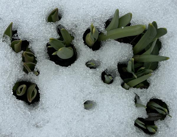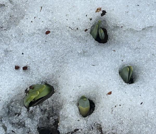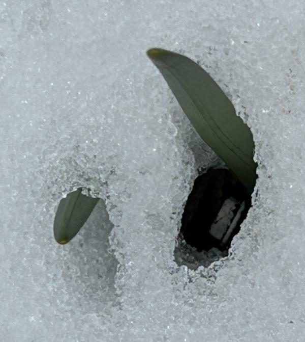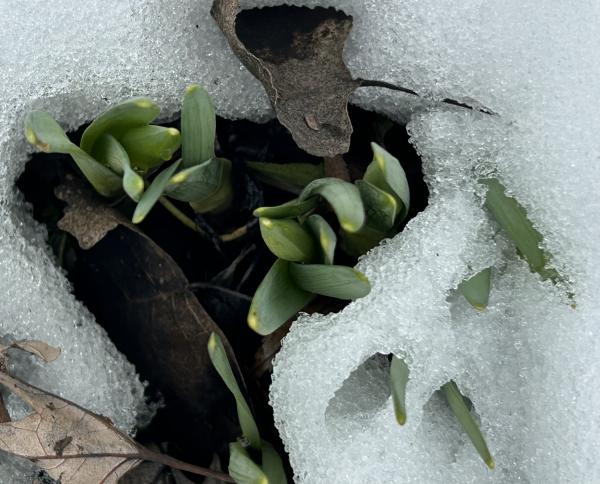 從夏洛特回到芝加哥,一出機場,立即感到了冷。都2月8日了,最高氣溫才攝氏零上3度,三個小時前,可是16度啊。但冷也有冷的好處,看到雪了。是前幾日下的吧,地里的雪還沒化乾淨,路邊有雪堆。 過了一日出門散步,回來時突然想起了門前的水仙花,會不會出牙啊?蹲下,低頭,仔細看,果然,在桔黃的枯葉下,冒出了幾張小嘴,是嫌冷嗎,兩片綠嘴唇抿到一起,唇尖上塗了一點淡黃色的口紅。 好喜歡。雖然立春已過,但芝加哥地區還是殘冬,陰冷。草坪也不見一棵春草。小小的綠色水仙花,是報春的第一片綠意。 天天出門散步。路上的行人還穿着棉襖,但水仙花們卻披着一身薄薄的綠衣衫,每一天都把衣服撐大了一點點。 那日下了雪,雖然不厚,但還是壓住了它們。過了一日,雪面上裂開一道縫。又一日,縫隙成了一個小洞,黃綠的葉尖,鑽出了雪面。雪白,花綠。 幾日前下了一場中雪,20厘米厚,把長出綠葉的水仙花全都壓上了,蓋得嚴嚴實實的。但我知道了,儘管氣溫夜裡降到零下四五度,但水仙花是凍不死的。果然,三日後,它們復活了,從潔白的雪面露出腦袋,連雪洞也被撐大了許多。天哪,有兩株已經含苞。從露出地面那天算起來,已經整整過了一個月零一天。