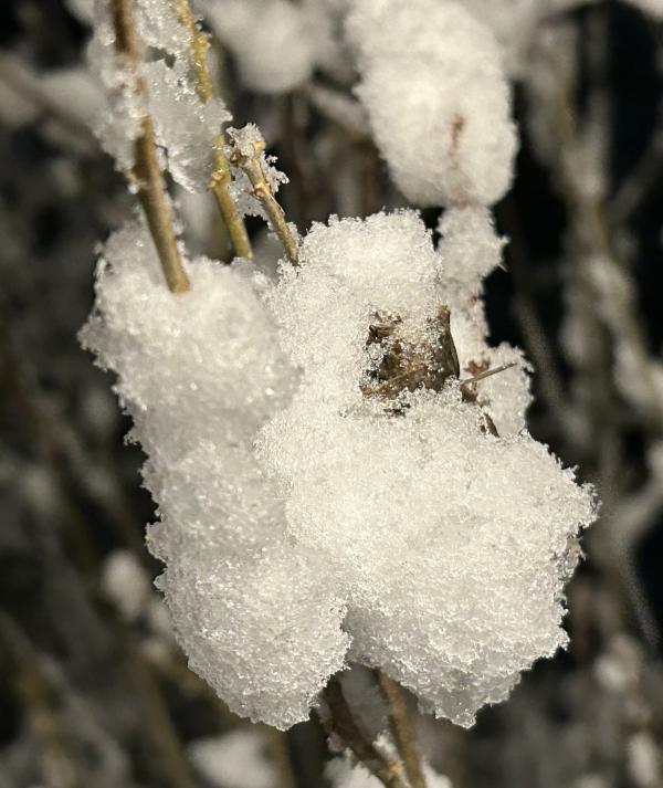 独自坐在书桌前,抬头写作,一字一字地打到电脑上。眼睛累了,低头看一下手机,啊,夜里九点半了,我才走了八千多步。 扫兴,外面下雪,不能在夜空下行走,只好在屋里内循环了,在一楼的房间里挨个走。 走的急,圈也转多了,头有点晕。无意间朝窗外瞅了一眼,啊,树挂,雪绒花!雪花沾满了木槿树的枝头,一根树枝被压弯了,一串白花在窗前颤抖。马上想起了古诗:“一支红杏出墙头”。哈哈,现在是白杏朝屋子里看,看我一眼。 拿起手机,赶紧出门。 细细的雪点还在下,簌簌声声。门前的木槿树、日本枫,和伏牛花灌木丛,全都沾满了小雪花,花成团。虽是黑夜,门前的灯光还是让朵朵雪花亮白。花儿成了串,花儿跃上枝头,花儿裹着一粒小小的红果。不是春风,是春天的雪,让千树万树开满了梨花。 梨花儿的瓣厚墩墩的,绒乎乎的,一丝丝的绒毛,过一会儿就化了,成梨花泪,泪千滴。 主啊,我以为今年不会看到树挂了,还觉得挺遗憾的。没想到,你让花儿在夜里开放。你的恩典奇妙。 花开花谢,但那一滴滴雪珠不是别离,它们是回家,滋润那正在解冻的大地。 2023.3.9日夜记事。