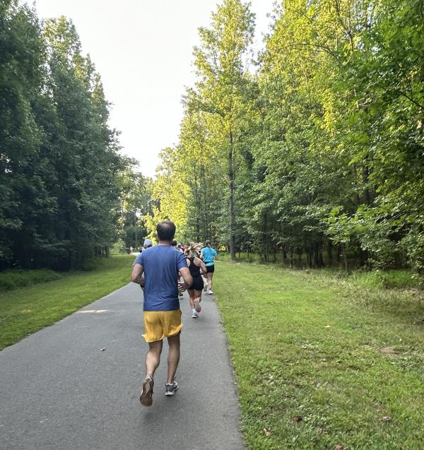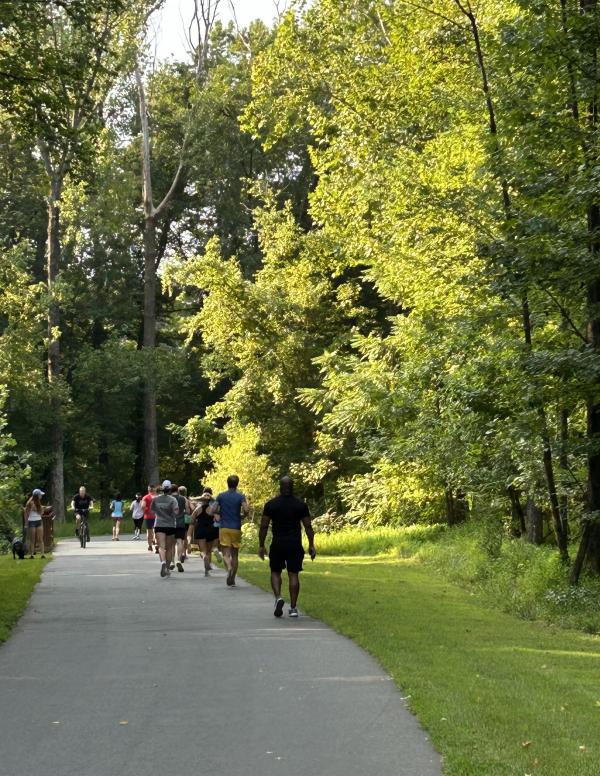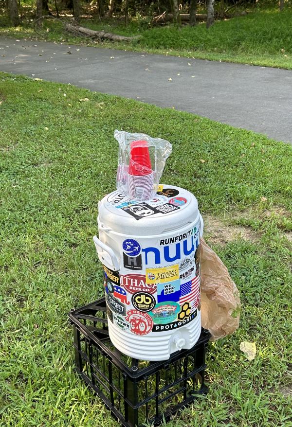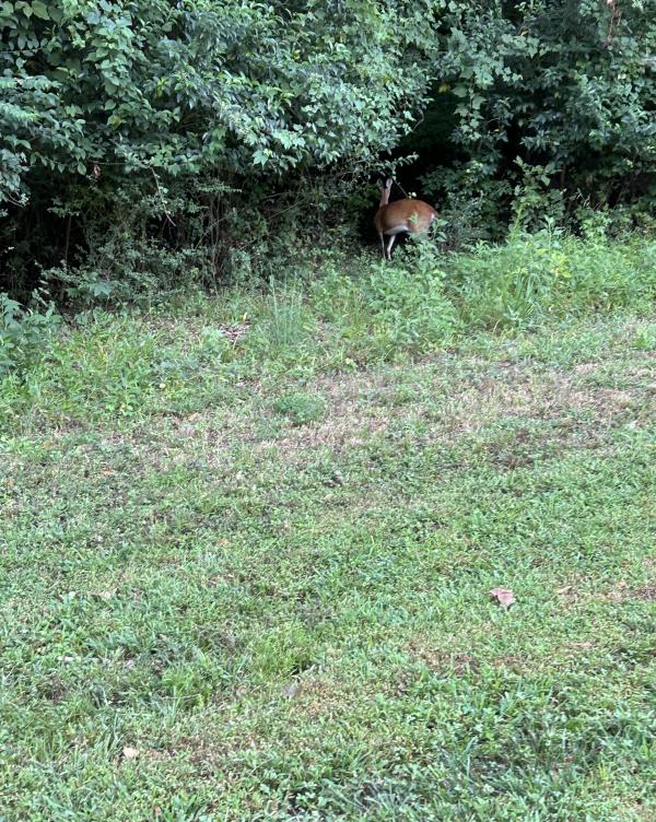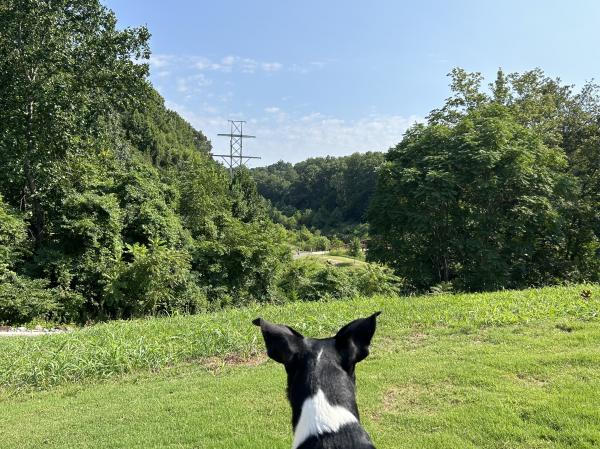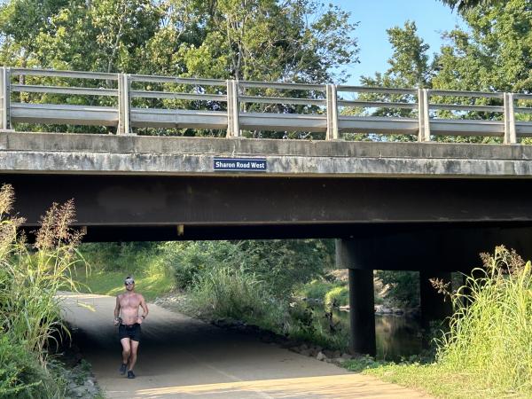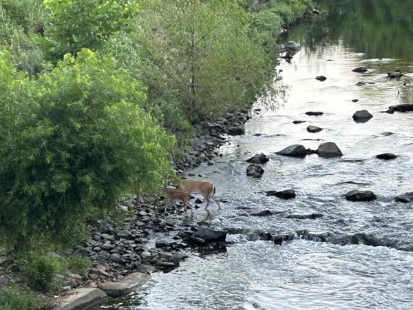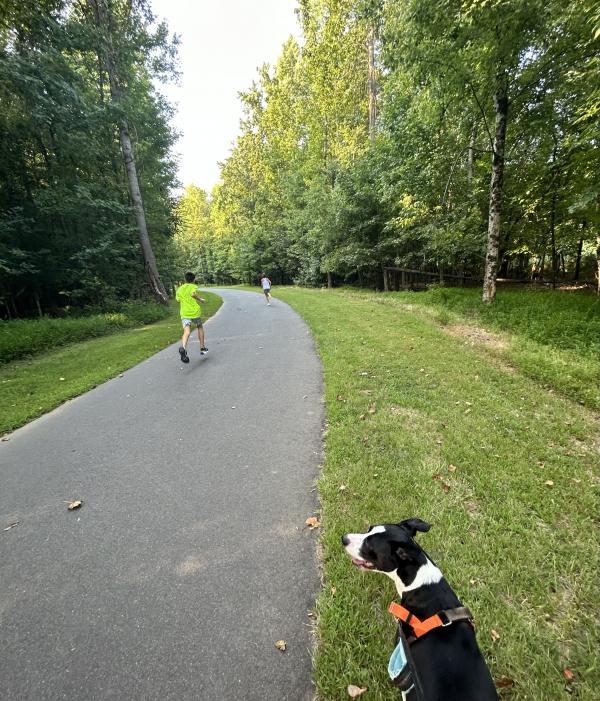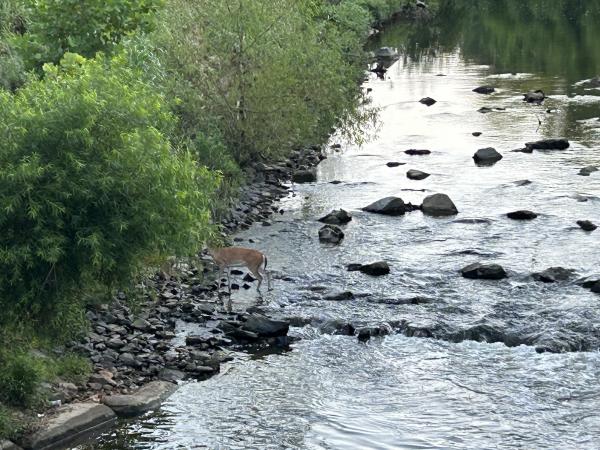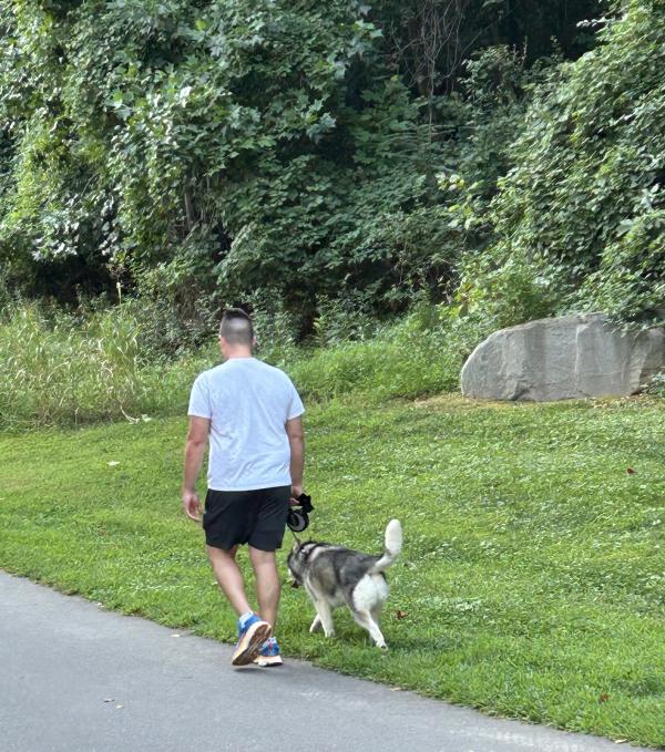 有點小得意,剛走上綠道不過百米,我就看到了一頭大鹿橫過綠道。我牽着的狗——娜拉沒看到,平日裡大都是它先知道。但此刻它正低頭聞路旁野草。 今天是星期六,一大早就出來鍛煉的人比較多。前方的人停下,似乎用手機拍照或錄像,也許是,給鹿讓路。又一隻鹿也穿過路,第三隻居然是小鹿,跟在爸爸媽媽的後面。再後面的兩位,是姑姑叔叔嗎?或舅舅姨姨。押後。 娜拉聞到鹿群的味道了。這麼強烈的鹿群味道要是再聞不到就不是狗啦。它拽着我急速前進,但還是晚了。第五隻鹿也走進了路旁的樹林中。 待我們路過那片小樹林時,似乎是為了安慰娜拉,一隻鹿走出林子,跟娜拉打了個照面,也許說了早上好,但我不懂鹿語,娜拉翻譯中文的能力也極其有限。 我和娜拉都有些遺憾,帶着遺憾走吧。走了五六分鐘,走上橫跨小糖溪的鐵橋,前方,一隻,又一隻鹿,整整四隻,橫越溪水。河流清清,水光青青,鹿群黃黃。我止不住地讚美,主啊,感謝你。站在旁邊的一位女士說,太美麗了,是吧?是的。看,娜拉都屏住了大喘氣,默默地觀賞。 走步的,跑步的,騎自行車的,源源不斷,迎面而來,從身後超越。好些男人,光着膀子。女性,上身只穿運動背心。步伐,有沉重的,有輕鬆的,這人滴下汗水,那人臉上背上的汗珠,在陽光下閃亮。 與相遇者說一聲“嗨”,聽到身後騎自行車的人喊:“在你左側!”立即,舉起左手,揮揮手。她說,謝謝你。我也回一句話,還是謝謝你。 好感人,爸爸推着小車也在跑,孩子坐在車裡扭過頭,看狗。遊樂場內,父親正推着小女兒打鞦韆,飛在半空中的女兒看得遠,她對着一個跑過來的女子大喊:“媽媽,加油。” 我需要給狗加水。路旁的公園正好有個飲水機,將下面水盆里的水倒出去,洗乾淨盆子,加上新水。狗歡喜了,大口地喝水。我的嘴對準上面的噴頭,也喝上幾口。 快秋天了吧,微風,微涼。趁着氣溫不高,才攝氏零上20度,多走幾段路。一群人跑過來了,十個,二十人,將近百人,有老人,有小學生,還有許多年輕人、中年人。原來,每個星期六上午九點,都有一次長跑。路旁有個標識牌,上面有二維碼,掃一下,就可以參加。 瞬間瞎想,我要是年輕…… 繼續走吧,走過野地,走過樹林,走過橋梁,上面寫着“Sharon Road West”,這是以前走過的最遠的地方。今天,連狗都這麼高興,坐下來,歇一會兒,繼續走。 隔着溪水,聽到打板球的聲音,綠色遮住了視野,只聞“梆梆”聲,不見一人。另一處,原來的網球場成了板球場,三四組人,梆梆,梆梆,聲來聲往。越過大草坪,人影與球聲都傳得很遠。 前方,兩個男人隔着路面講話,各自帶着一條狗,這可是兩夫當關,我停了一會兒,他們的話還停不下來。扭頭,我往回走。 哦,這是什麼?通向小區的路口旁,在一個方形塑料筐上,放上了一個圓形水桶,桶面貼滿了小招貼。最上面還有紙杯子,紅色的,還有一個棕色垃圾袋。二十分鐘前路過這裡時還沒有,是誰,送來及時雨。 在另一個寬敞的休息點,放了兩把長條鐵椅子。一把椅子中間釘了一個小貼牌,上面寫着: “Love One Another Renee Estep‘ 22 “你們要彼此相愛”,人間最美的聲音。 又到了公園旁的飲水處,讓狗再一次暢飲。然後,坐到大棚子下的長條椅上歇一會兒。一個男士坐在另一條椅子上,也帶着狗。人彼此說過“嗨”後,狗也渴望交往。它們聞聞嘴,又將頭伸到對方腹部下,再聞,屁股,友好交往。男主人說他的狗叫Mali。說,這裡的人很友好,社區很安全。以後Mali再見到娜拉時,就是朋友了。他沒說我們,但從目光里我已經看出來了,我們是朋友。 他妻子推着兒童車開跑,裡面坐着他們兩個漂亮的小女孩,是雙胞胎嗎? 再見。我和娜拉繼續前行。走到一個大長條的草地邊上時,娜拉特別興奮,它躺下打了好幾個滾後,奔跑。跑了幾步後我對它說,我累了,你不演《奔跑吧,兄弟》好嗎。幸好它不懂,要是明白了就會說,老范,你這是性別歧視,小女兒並非雄性。 快走回小區了。爬上一個陡坡後,在坡頂的一把長條鐵椅子上坐定,休息。娜拉沒有坐下,它站着,站在高坡它看得很遠,有人跑過去,有人跑過來。她要是想指方向的話,很困難。也許它想到了自己今天的偉大成就,上午拉了兩泡屎,每一泡都全無古人。 我想到了一個觀念,逃城,也叫避難所吧?現今,它不是一個固定的地方,而是途中。 終於,到家了。截圖,今天早上走了17,375步,消耗了420卡路里。算算,花了將近三個半小時。 2023.8.19 完成於下午3;57