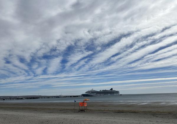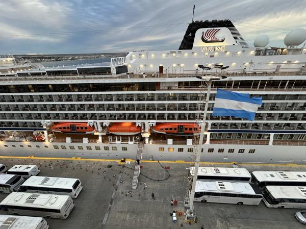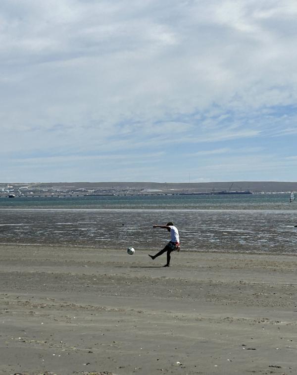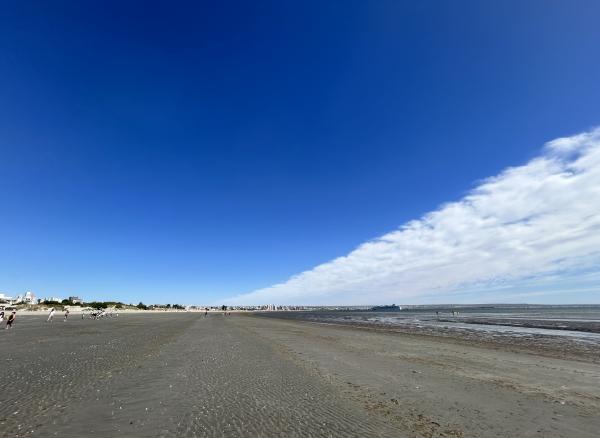 同游者说,今天停泊的港口是阿根廷第二大城市,多大,吾不知,连叫啥名字都没打听。 同船人不同道,有的交钱后,搭车去什么野生动物园了,我们,一行七人,单独行动,换言之,不花钱。 下船了。走过长长的栈桥,桥头,好几位招揽游客,我们,不差钱,差的是花钱的决心。决定,沿海边堤坝,且谈且行且观赏。目的地,前方四公里外的一山头,那里是个公园,据说,站在那里可以将全成景色尽收眼底。当然,眼底要有足够的宽度。 不会迷路的,走着走着,我自寻歧途,走入海滩,时而见几个游人,岸边上玩耍。 一群,又一群的孩子,玩足球,男孩子,女孩子。教练,一两个,在前,在后,他们也不过十七八岁。 第三群孩子,十几个,教练,一少女,一少年,最小的队员,不会比足够高过五六个头,他也一边走,一边踢。身边,一红色女娃,也就大他两三岁,踢不着时,为伙伴加油。男娃娃走进海藻区了,还是不停止脚下的球,我也跟着走进去了,海藻腐烂了,远看,以为是坚实的黑土,一脚下去,污水立即上了鞋帮,还自带腥臭。硬着头皮,我走出这片沼泽地。但那男孩,还是自得其乐,全部理脚丫子的沦陷区,其他几个小伙伴的脚背,跟着沦陷。但,眼不离球,小小的足球,在前,在后,在传递中。 沙滩上,他们时而一人踢,时而两人,抢球,断球,传球,人在,球在。笑声,笑语,随海风而逝。大海,湛蓝,风,微微,远处的长空,一堆白云裁断蓝天,陡立的云坡自高天而兀立。一女子,身着红衣,在白云蓝天下,走向大海。 我在海滩上走了好一长段路后。跟身边的小朋友们再见,再见。穿过沙丘,我归回正路。却不见了同伴,立即回头找,找了好一段路后,不见人。醒悟,他们肯定是走在我前面了,立即转身,回头,小跑,追同伴。 跑着跑着,急停,沙丘旁的水泥台阶上,正坐着那一群小足球先生小足球小姐们。我们的目光在欢喜中相遇,我给他们拍了一张正面照。再挥手,这一次真的再见了,大概率,此生不会再见面了,但他们,让我看到了玩足球的喜乐,或者说,热爱,酷爱。 追上同伴时他们已经到达了终点,正坐在一个小屋子休息,等我。不知道这是什么屋子,无门,屋顶竖立一十字架。旁边一条木板栈道,走在栈道上,终于见到了全市的景色,远处,隔着大海,蓝天下一切都那么渺小。 一石碑,刻着几个字:Puerto Madryn,中译,马德林港。原来这就是这个阿根廷第二大城市的名字。旁边,三面旗帜空中飞舞,呼呼作响。中间一面,阿根廷国旗,图案,三大长条,蓝白两色。 回头,走回头路。路上,起了风沙,大风从海上吹过来,夹带着大粒的沙子,连我的脸也不放过,使劲地打。痛啊,疼啊,说了几年的封杀,居然还有这样的风沙法子。 风沙就封杀吧,哥也不是没被封过杀过,我再次偏离正路,朝着海边走去,一直走到海边,蹲下,抹一手指头,闻闻,海藻的臭味,够味。顺手,拍几张照片,一美女独自坐在海滩上,一对情侣,深情地接吻,爸爸,妈妈,一家人,在海风中欢乐。 我一直走到栈桥低下,桥梁上好多贝壳。风,更大了,沙子变向,从岸边的沙丘吹向大海,一条条流沙,在海滩上不断变形,奔向大海。 又上栈桥,桥头,两个阿根廷警卫微笑着点头,借机,与其中一位合照,历史性的瞬间,第一次与阿根廷人合影。 归途中,见几人扶着栏杆低头看海,吾从众,赶紧低头,一水母正尽情游动,接着,又一个,正中似乎还有一个红色光环,也自由自在。以往在水族馆看过水母,美则美矣,但从不能尽情尽兴。 爱自由,亦是水母的本性,唯有在大海中,水母才尽享自由。 南极游 8
