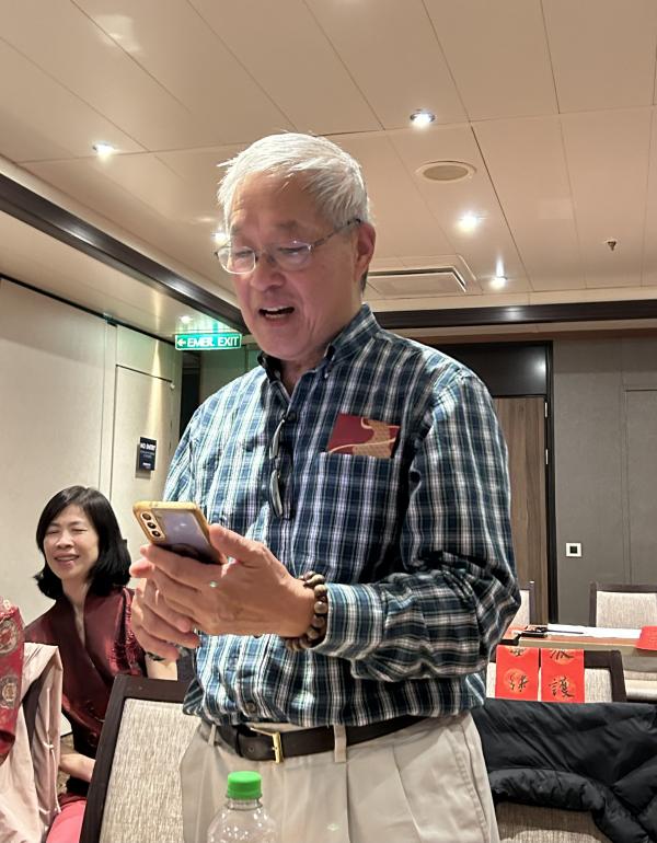 不是燕姐、谭先生、张云飞、Jenney他们组织这个农历新年晚会,我都忘记了今晚是除夕,大年三十。他们预定好会议室,晚上时间一到,立即,将近三十位同游者都来了,有的还带来了新朋友。 大西洋,去南极洲途中,欢庆龙年,这得多少条龙阿,才能在大水中腾跃。活了快七十年了,第一次这样过除夕。 除夕。 除夕。 主持人Jenney身着华服登场,非正式宣告,晚会开始啦,会场气氛立即不热不冷,亦轻亦重。有没有掌声,笑声,忘了。印在心里的是一张张笑脸。 新年快乐,恭喜发财,这是中国新年的老话、套话、吉利话。虽然此时身在南美,还得循老规矩行。抽奖,中奖者,得红包。包内的金钱,是某某奉献的。 一个个人陆续中奖,笑颜中开,大开,有两对夫妇分头中奖,各自献出一个红包,让其他人再抽。康妮大声提议,中奖者要请我们吃法国大餐。片刻后,她脱离了“我们”,也得了红包。立即,取消前言,让法国大餐成为大西洋上的画饼。 绝大多数驴友都中奖了,我是剩下的极少数。看来,今年是没有希望成为亿万富翁了。 嘻嘻哈哈、欢欢喜喜,我们开始唱歌。燕姐开头,唱什么《真的好想你》,粤语。你?谁?不可考。施玮朗诵诗,刚出炉的。唐叔唐婶合唱,风采飘飘。我献丑,唱那首香港流行的名曲:“唱哈利路亚赞美主!”还配合上行进动作,张君励随后,她要是用粤语唱,更有历史感。我唱疯了,竟然振臂,但没高呼革人命的口号。也许该喊:“打倒美帝,打倒苏修,打倒各国反动派!”文革中我们叫喊了几乎十年。 压轴戏,写春联。黄秉骥先生,唐叔,黄佩珍纷纷泼墨,我要了黄先生写了上联:“乘风破浪真平安。”唐叔给我写的下联是:“桂林山水甲天下。” 冯国清的上联写着:“以马内利主恩在”,后来又对了下联:“哈利路亚福满溢”。 张君励后来说,因时间关系,她当晚没有拿到Jenney的墨宝。Jenney说以后再给我补上。没想到下船前她把墨宝包装得很精美的地送到了君丽的手上。而她又将这墨宝置放在家中, 这故事我听了都很感动。 我们结束时中国和台湾都已经是大年初一,我们哼哼“难忘今宵”来彼此告别。没想到,一些人不会唱。何频说,我看不会唱的都是台湾人。 突发奇想,央视春晚要是直播我们这个分会场,一定举世震惊。转念,不可能,船上网络几乎不通。我们是漂着过年的。 出门时,我顺手把门口贴的“福”字带走,弥补一下没得到红包的心理伤害。 2月9日记事,星期五,南极行第六天 3.10修订部分照片。驴友拍摄