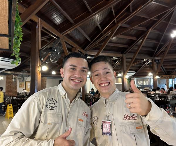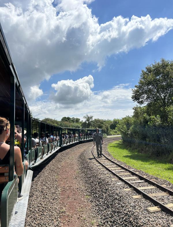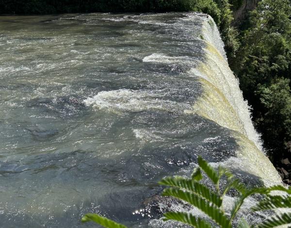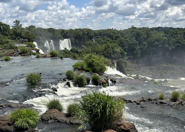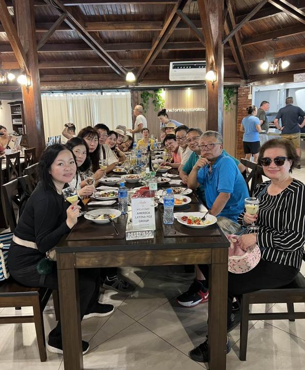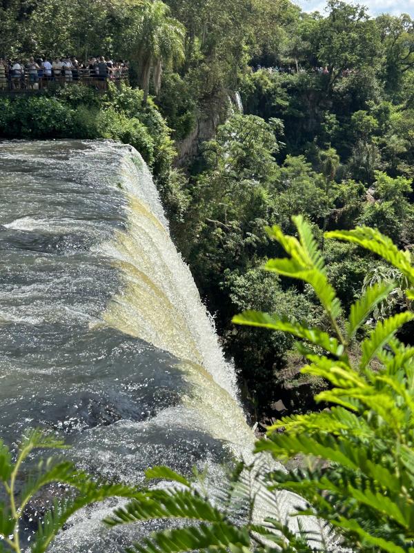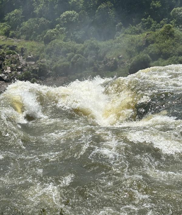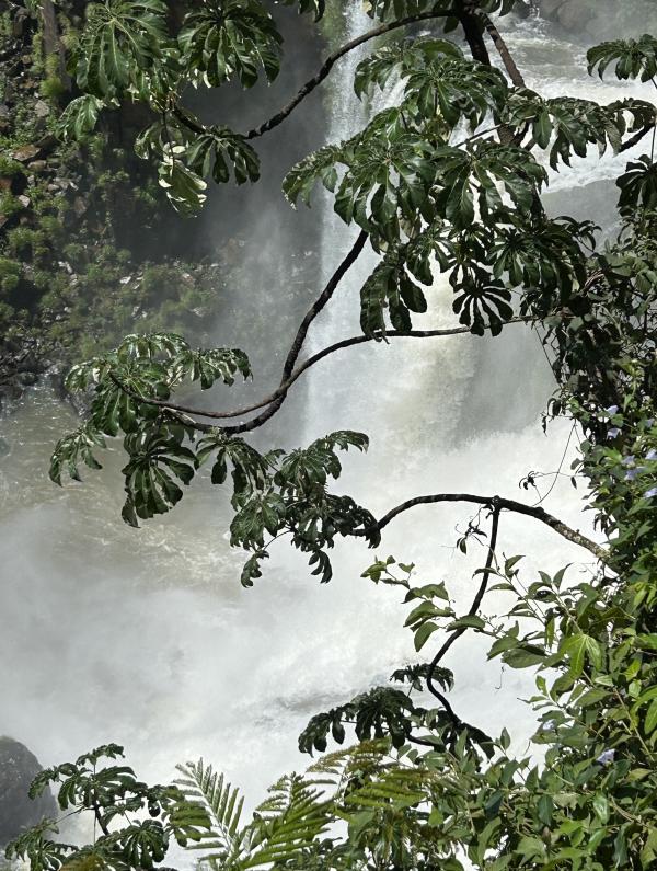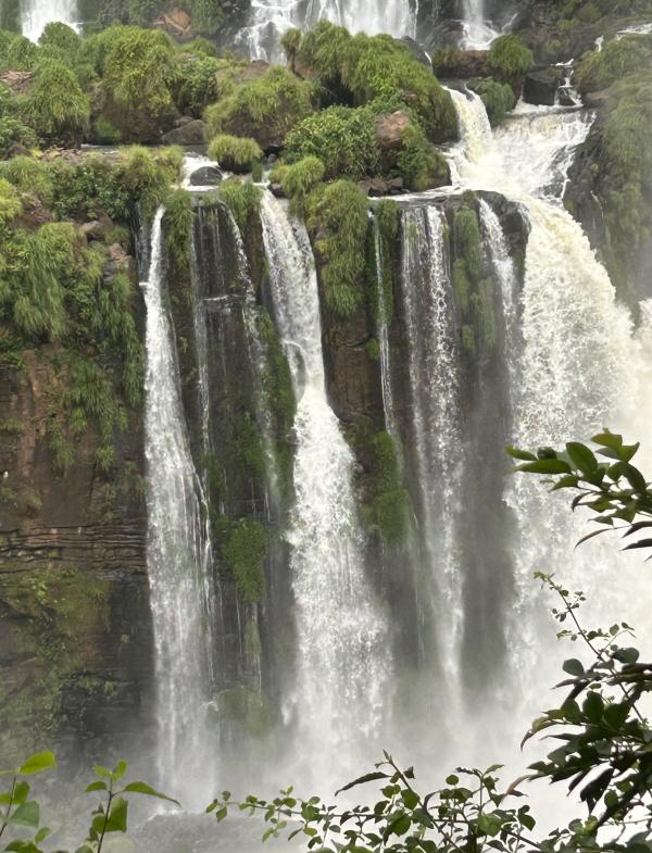 未见其面,先闻其声,声声夺魂夺魄夺人,哗哗,隆隆,轰轰。百米之外,雷鸣灌耳。 伊瓜苏瀑布,你终于来了,来到我眼前:一道灰白的水线弯曲,截断云天,大水,倾天而下,成大江,变大海,如银河,千军万马,东奔西撞,你拉我扯,瞬间坠入万丈深渊。 太壮观了。我不知道用什么词汇来形容,啊!哇!天哪!霎时间从心底喷薄而出。 不愧是南美洲第一奇观,来得太值了,为伊值得人憔悴,值得我一大早四点钟就醒来,赶飞机,飞两小时;值得饿着肚子,坐小火车穿行在林海中。 伊瓜苏瀑布,与维多利亚瀑布(Victoria)、尼亚加拉瀑布(Niagara),同为巨头,三足鼎立,各有千秋。你,独占举世最宽瀑布的鳌头。不愧为当今世界七大自然奇景之一,联合国教科文组织把你列为世界遗产,名副其实。 其实,最早的夺人之声是雄鹰发出来的,刚下小火车,还没有走上栈道,高空就传来声声鹰叫,蓝天下,绿林上,几十只苍鹰尽情起舞,振翅,滑翔,斜飞,直上,大大小小,远远近近,每一个舞姿,全都书写着两个字:自由。 我禁不住想起了那古老的话语,以马内利啊,他展开翅膀,遍满你的地。 查不过来有多少个瀑布,但导游早就告诉我们了,伊瓜苏由275个大小瀑布或急流组成,汇合成一个马蹄形大瀑布群,总宽度达2.7公里,最高落差为82米公尺。 连名字都有三个,Cataratas do Iguaçu,葡萄牙语;Cataratas del Iguazú,西班牙语。原初的瓜拉尼语意思最清楚,译成中文就两个字: “大水” 我们走在两三千米长的栈道上,桥随山转,转出蜿蜒,转出豪放,转出宽阔。这一侧,绿树,野花,蜥蜴,另一侧,百丈悬崖。时而,山间一水流,或宽或窄,平流着,流过我们脚下的小桥,但不过十来米,一流到悬崖边立即失身,失神,还没来得及惊魂,水魂已经跌入深渊,从看不到底的深渊深处,泛起团团水雾,迷迷蒙蒙,飘飘荡荡,似乎无声地询问,是谁?是谁把我推入悬崖底,令我粉身碎骨,一节节,碎了又碎。 小瀑布相伴,几道大瀑布,独挡这面,那面,或近或远,直挂,倒悬,倾注,是黄河,是密西西比河,是银河,无尽的大水,不断地翻卷,黄白青三色,瞬间直下。 长空,云也在翻卷,开云花,朵朵洁白,与水花遥相呼应。 我用先知的话语来应答:“惟愿公平如大水滚滚,使公义如江河滔滔。” 再次停下,看水中奇石,几块巨石鼎立在悬崖边,硬气是骨,青苔为衣。眼前,身后,全都是飞流翻腾。在它大石板上的一片绿水,转瞬就弃它而去,成道道飞瀑,泛白,泛黄。而在它脚下,四五道细流,不过几尺高,与它不离不弃,缓缓地流淌,流出朵朵洁白,点缀着绿苔藓块块。 竟有几株高树,站在悬崖边,用硕大的绿叶为清水遮荫。一簇簇青草也是这样的啊,站在褐色的岩石上,送去条条绿意。 可惜很快就走到了头,导游说,魔鬼咽喉上的栈道,几年前被冲垮了。我们无法来到它面前。远望,半圆形的垭口,无数大水,从三面倾注,声隆隆,水滔滔,雾气朦朦。“大海泻入深渊”,瑞士植物学家乔达的描述,太精彩。 导游露露还告诉我们,千万不要原路返回,走老路。到头了,走另一条路,回到出发的地方。然后,吃午饭,自助餐。听到了一个好消息,没赶上早班飞机的唐婶,乘另一架飞机 来了,露露安排的人接到了她。下午,她能和我们一起看瀑布群。 饿透了。导游告诉我们,这里的烤肉特别好吃。进餐厅,落座,放下包,直奔烧烤处而去,来块牛排,再来巴西烤肠。肉香,迷惑了我。又去加了一块,是猪肉。 哇,木瓜是天然成熟的,又软又甜,金黄一块。向一起吃饭的驴友推荐,待到他们去时,没了。这怎么行,我去等。过了五六分钟,柜台内的女服务员,笑嘻嘻地端出了许多木瓜,还是金色迷人。谢谢她后,又见三哥们正往酒杯里倒葡萄酒,赶紧拍照,他们的笑容比美酒还甜香。 照顾我们这一桌二十多人的小哥,至打我们落座就没停下来,并且,脸始终带着微笑。我叫停了他,真诚地说谢谢,并给他一点小费,略表谢意。他高兴地拉着我,说句英文的谢谢。我们笑着合影时,都竖起了大拇指。 下午,沿着另外一条路,我们从底下仰望伊瓜苏瀑布群。也许是上午的印象太强烈了,下午,多了一点平常心,偶尔停下,听听鸟叫,看蝴蝶飞,看野花怒放。 瀑布群顺着悬崖,一跌,再跌,争先恐后,川流不息。是大珠小珠落玉盘,又是群山万壑赴荆门,一瀑布,一山丘,碧玉山;一急流,一沟壑,深不见底。 又看到了鼎立在悬崖边上的那几块奇石。正面看,又多了不同的景色,原来,细流不止四五道,而是八九道,甚至更多,它们顺着悬崖,穿过青苔,细水长流,娥娜多姿,美妙绝伦,千真万确。 看不到它们的底,从魔鬼咽喉而来的众水,飞速穿过对峙的两道山崖,咆哮着,翻卷着,激起十几米高的水雾,雾成花,雾如梦,雾放歌。 歌声回荡在山谷,在我心。主啊,你的创造如此伟大。 来到两个瀑布面前,它们肩并肩,听说,这叫兄弟瀑布。兄也豪迈,弟也豁达,一簇巨大的蕨类植物,用绿色向它们致敬,几朵白花开在绿叶间,似乎告诉我,它们相悦相爱,即使干枯了,死时也不分离。 告别瀑布前,我们聚到一起,导游突然告诉我们,你们看,大嘴鸟,巴西的国鸟。哇,两只,正站在高高的树枝上。莫非,你知道我们马上就要去巴西了,提前来欢迎我们。谢谢,太客气了。 2024.3.19